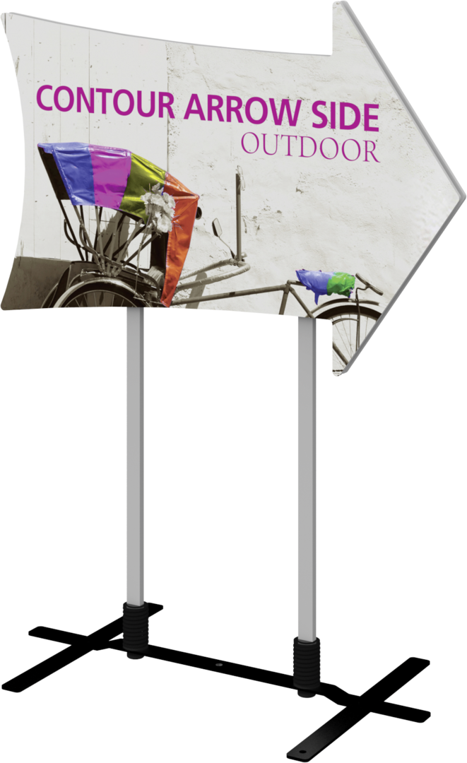 The Contour Arrow Side with steel plate base is a heavy-duty double-sided sign that utilizes hook and loop connections to make graphic changes quick and simple. The discreet plate base comes with four ground stakes for added stability.
