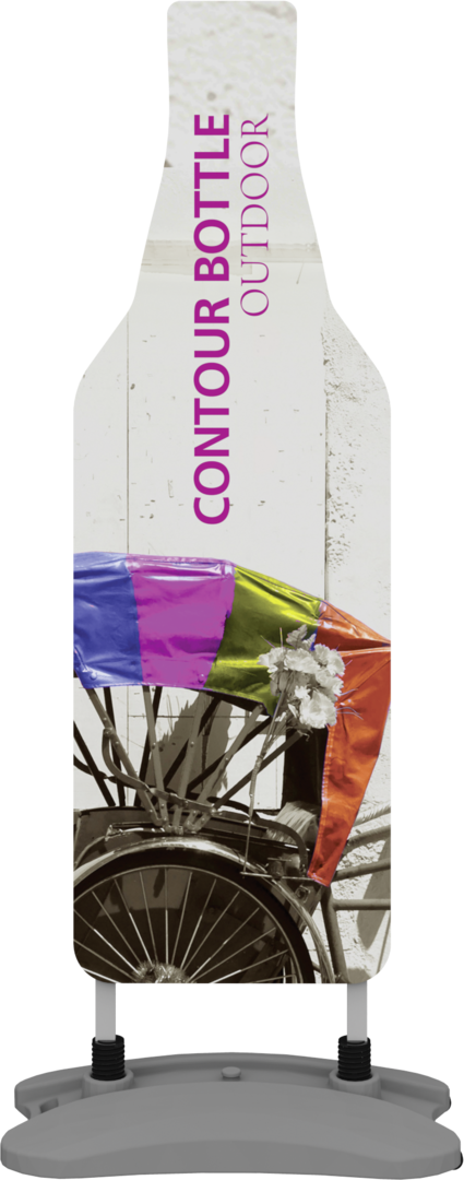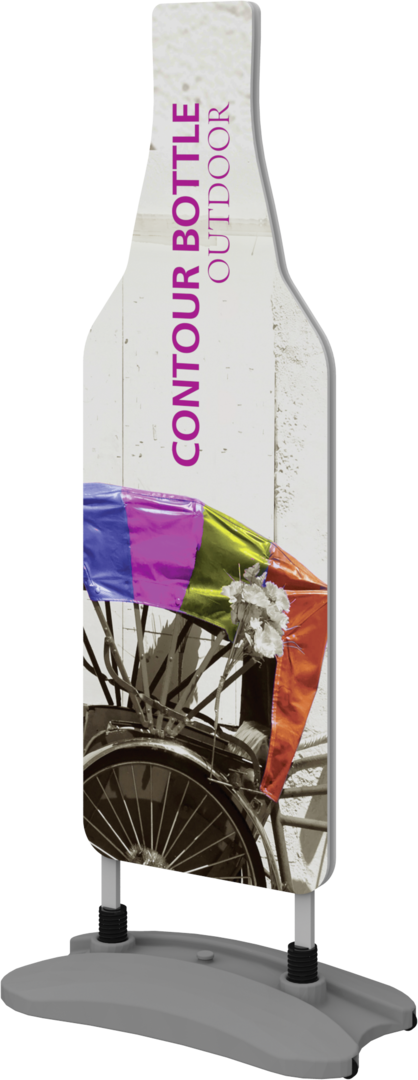 The Contour Bottle with water base is a heavy-duty bottle shaped double-sided sign that utilizes hook and loop connections to make graphic changes a breeze. The compact, molded water base features integrated wheels and a handle for easy transportation and can be filled with either water or sand for added stability.