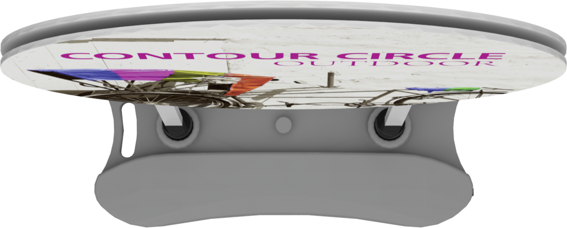 The Contour Circle with water base is a heavy-duty double-sided sign that utilizes hook and loop connections to make graphic changes a breeze. The compact, molded water base features integrated wheels and a handle for easy transportation and can be filled with either water or sand for added stability.