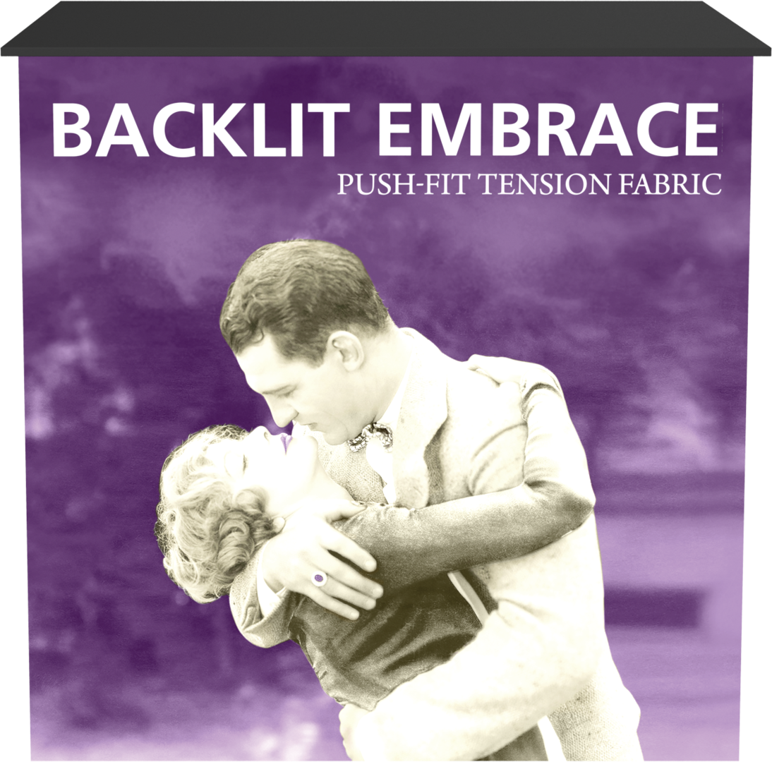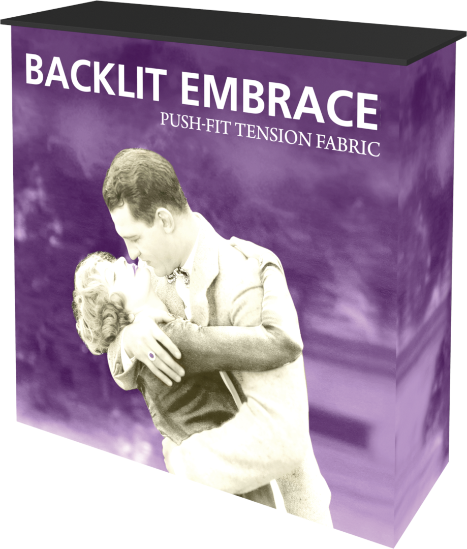 The Embrace™ Backlit Counter is a sleek, collapsible push-fit tension fabric counter that delivers a vibrant pop to branding and messaging. The Embrace Backlit Counter pairs a collapsible, white frame and channel bars that hold push-fit SEG fabric graphics. Lights attach simply to the top and bottom cross bars. The counter comes with Intensity backlit fabric graphics on the front and a whte backer. The counter is finished with a laminated counter top for a sleek appearance. Embrace Counter requires no tools for assembly, is lightweight and highly portable. It packs away as easy as it sets up!