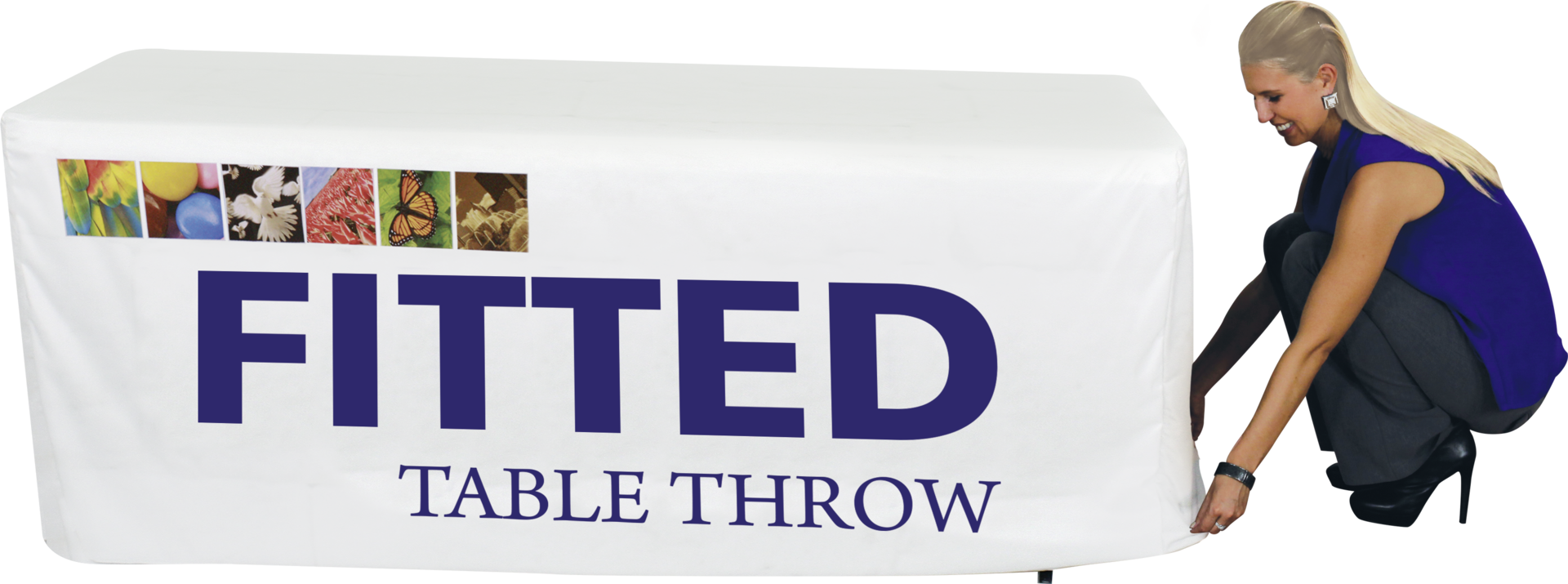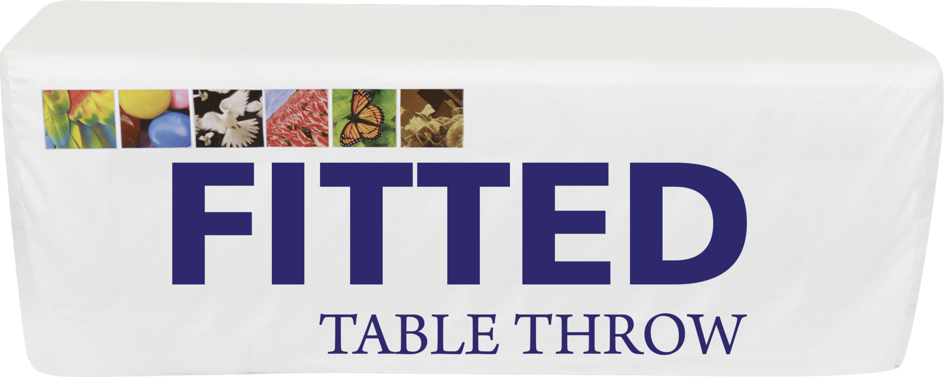 Fitted table throws are form-fitted to standard 8ft, 6ft, 4ft and 4ft tall (48″W x 36″H demo table) tables to provide a polished, customized and branded appearance for use at sales events, presentations, trade shows and in retail environments. Fully-printed in the USA on washable polyester using dye-sublimation to produce vibrant, full-color graphics, the Fitted Dye Sub table throw will complete your presentation in any setting.