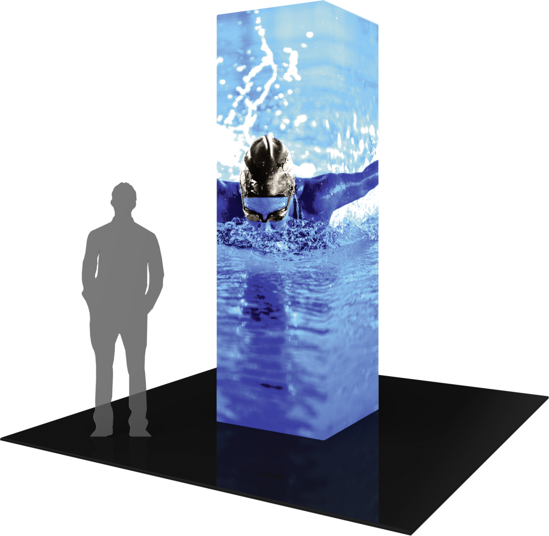 The Formulate® Backlit Tower 02 is an illuminated 10ft tall, 3ft square structure that will transform any environment through form, fabric and lighting. Perfect for inclusion in a tradeshow exhibit, to cover columns in an exhibit hall and for events and retail displays. The Formulate Backlit Tower 02 combines the latest developments in fabric printed technology with aluminum tube frames and interior LED lighting to add dimension, decor and sculpture. Mix and match with other Formulate architectural structures, backwalls, counters and kiosks to create your own display. Captivate your audience with an illuminated fabric tower!
