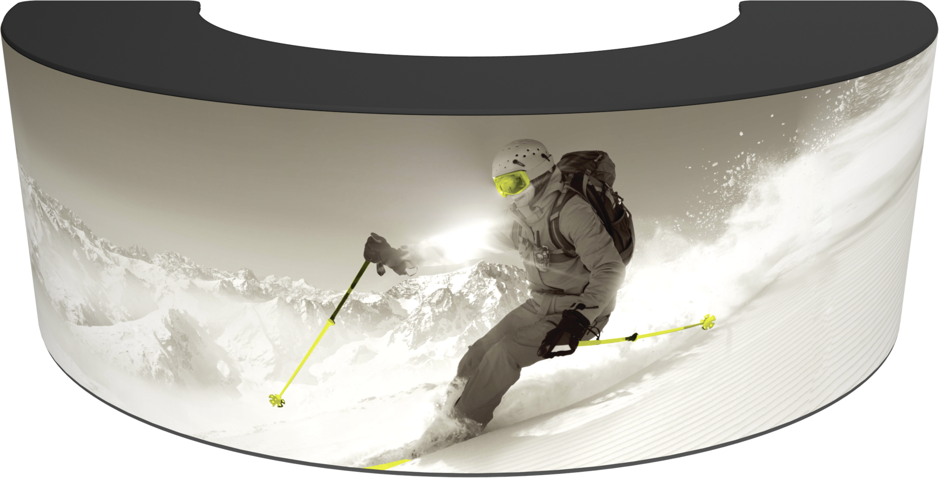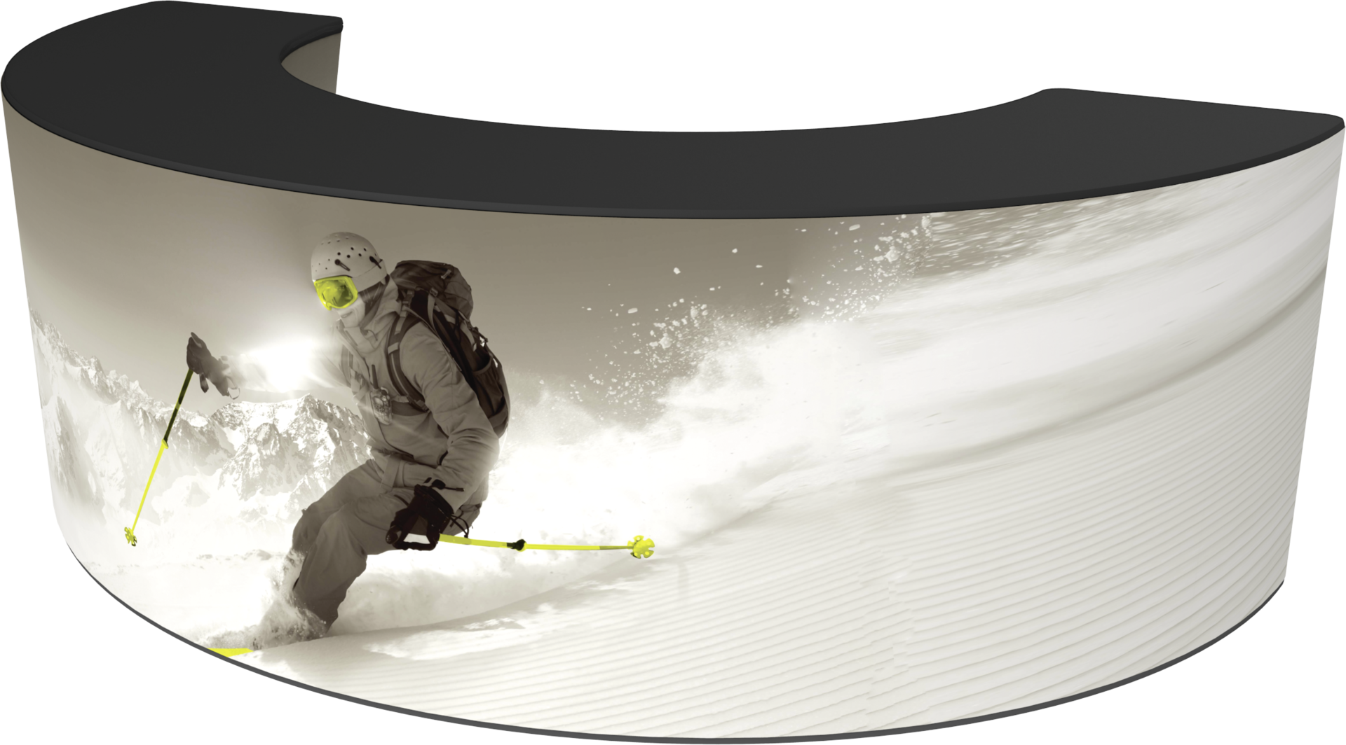 Formulate® Bar counter 04 adds modern flare to any trade show exhibit, event or POP display. The curved counter pairs push-fit fabric graphics with a durable countertop and base, and provides the ideal configuration to create a display or reception counter.