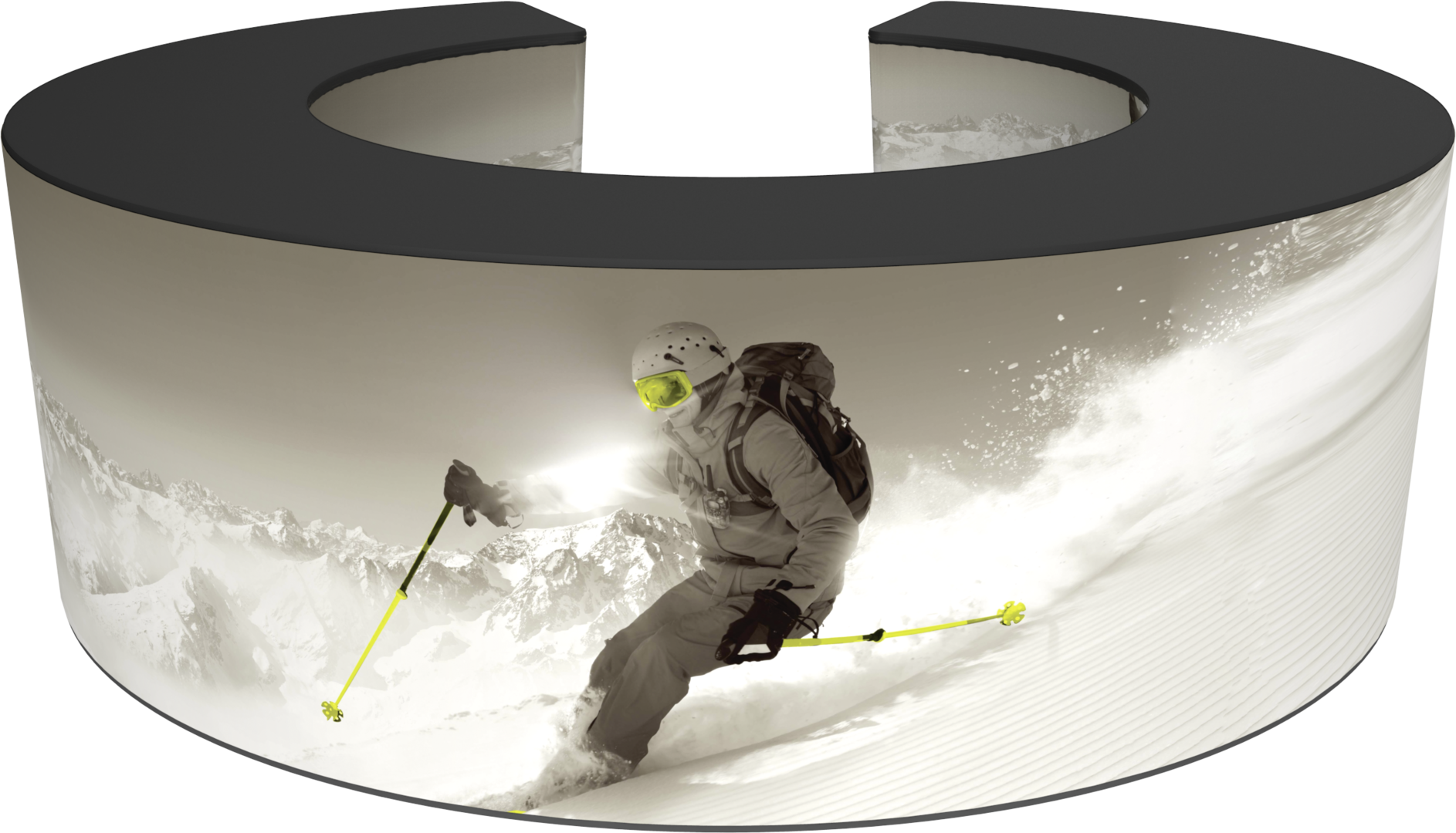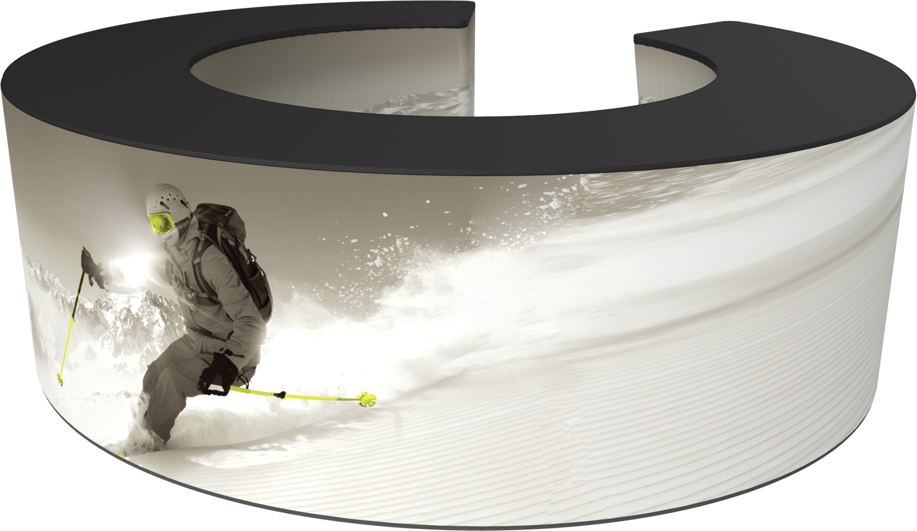 Formulate® Bar counter 07 adds modern flare to any trade show exhibit, event or POP display. The curved counter pairs push-fit fabric graphics with a durable countertop and base, and provides the ideal configuration to create a display or reception counter.