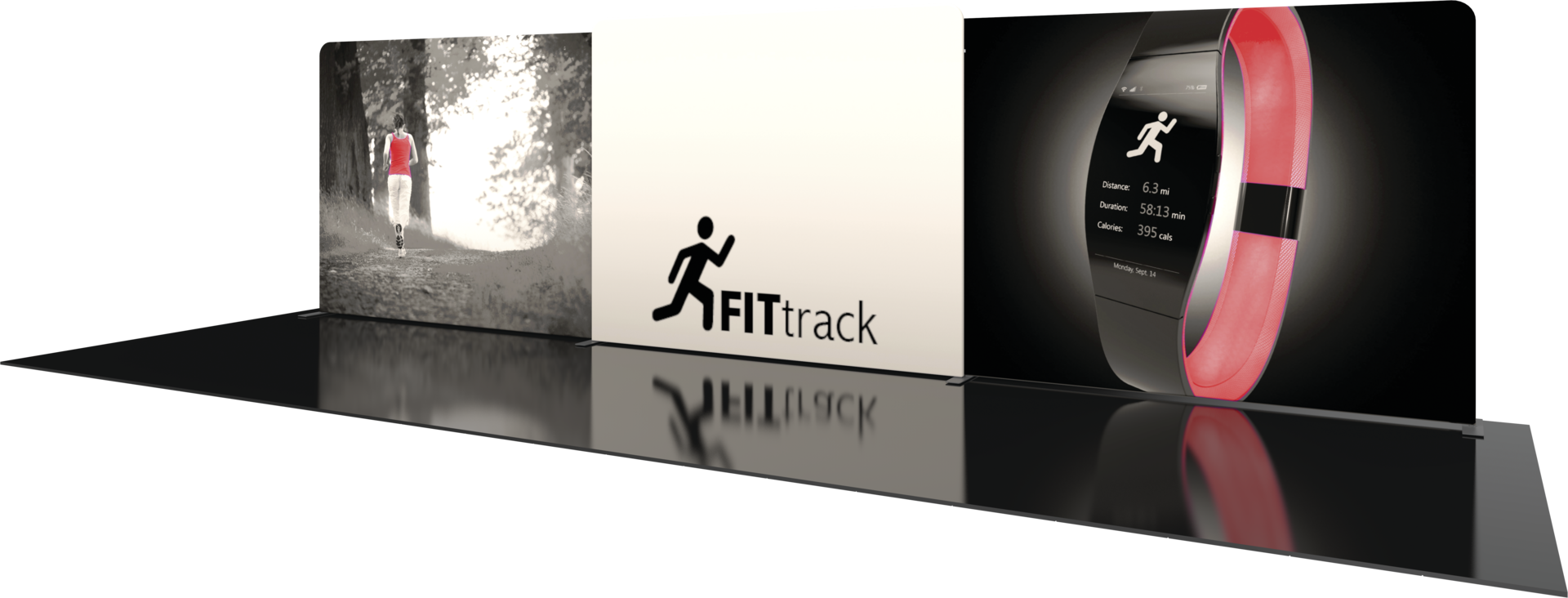 Formulate® Designer Series 30ft Backwall Kit 05 combines three straight backwalls to create a dominating, expansive inline display. The center wall is slightly taller than its neighboring walls, creating dimension and adding an element of style. The kit includes three aluminum tube frames with snap-buttons and three zipper pillowcase fabric graphics. Assembly is simple – connect the tubes, pull the graphics over the frames and zip.