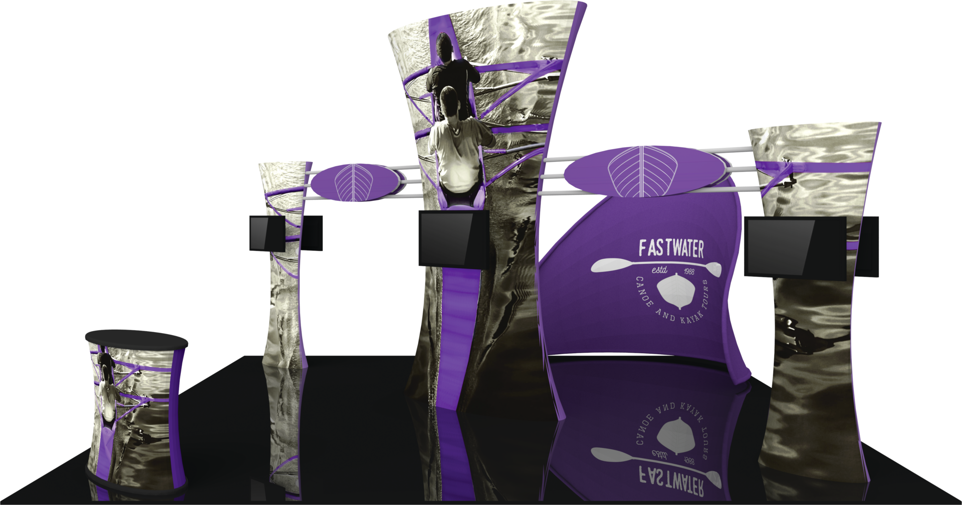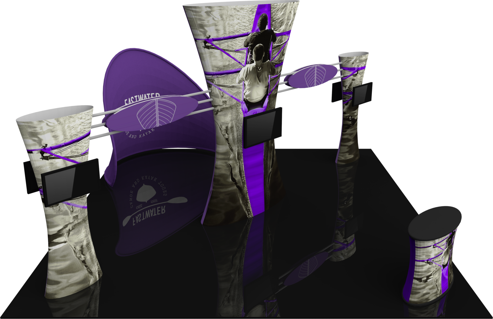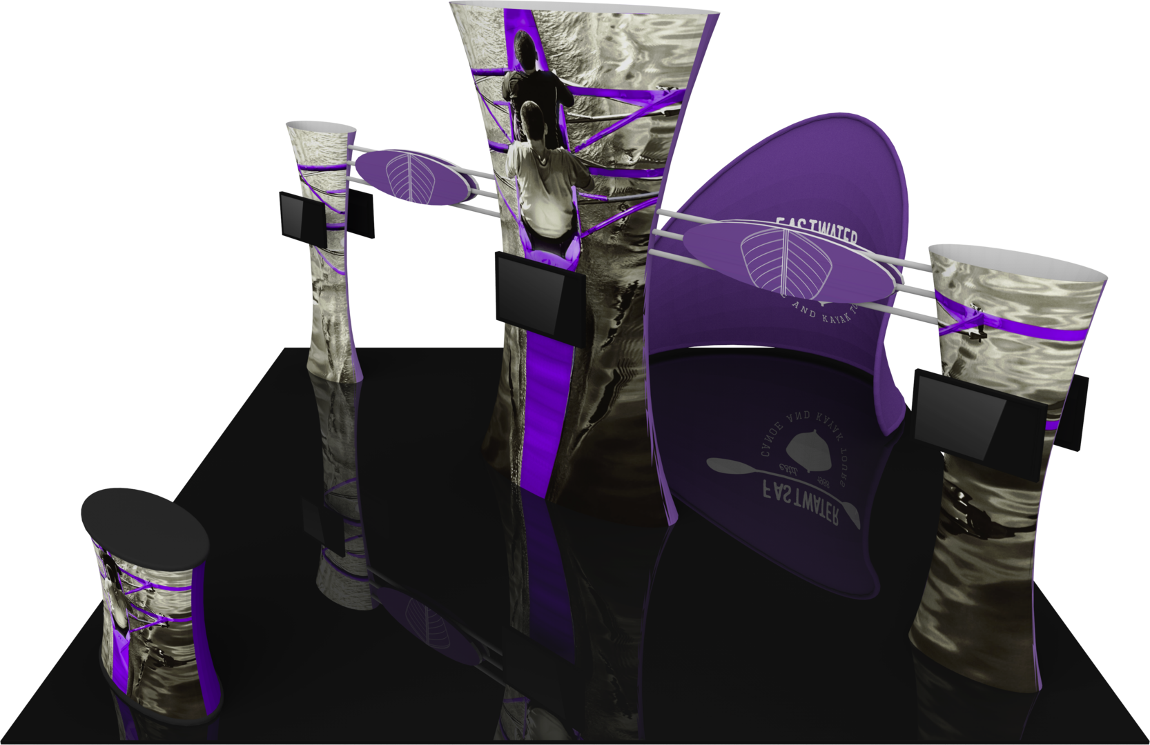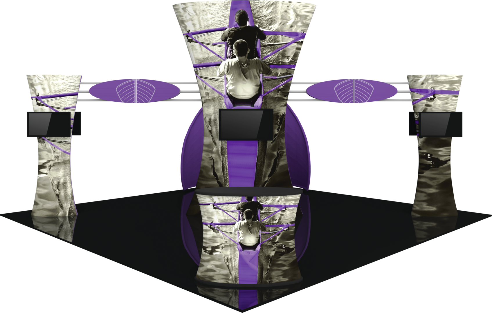 – Kit includes: fabric center tower structure, two side fabric tower structures, rigid graphic accents, chip wall conference wall, oval counter, five monitor mounts and 1 woodcrate