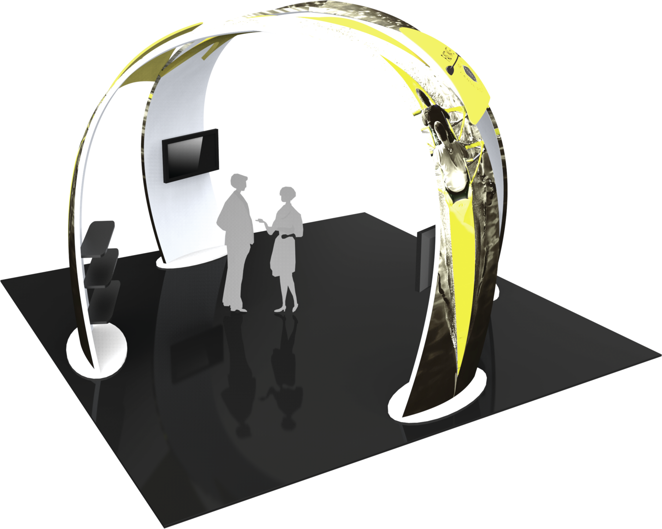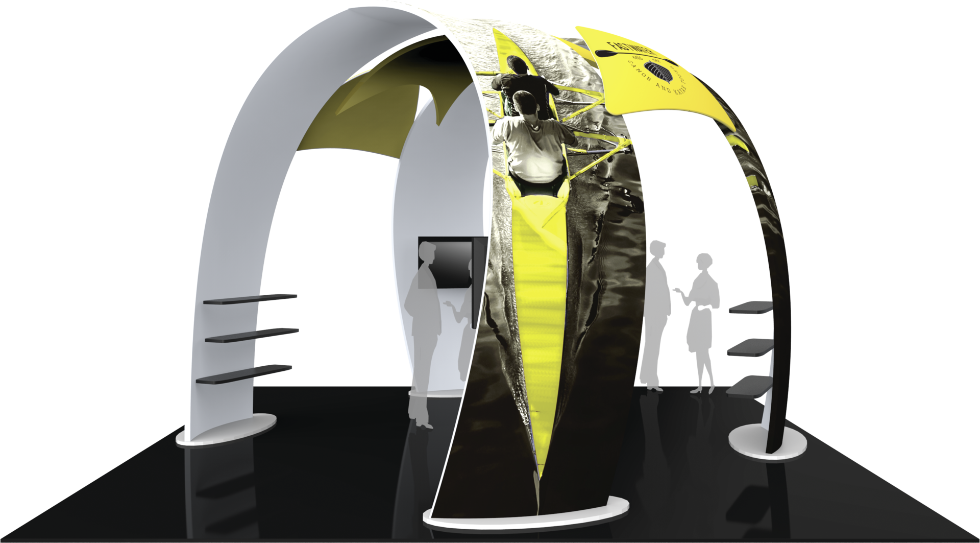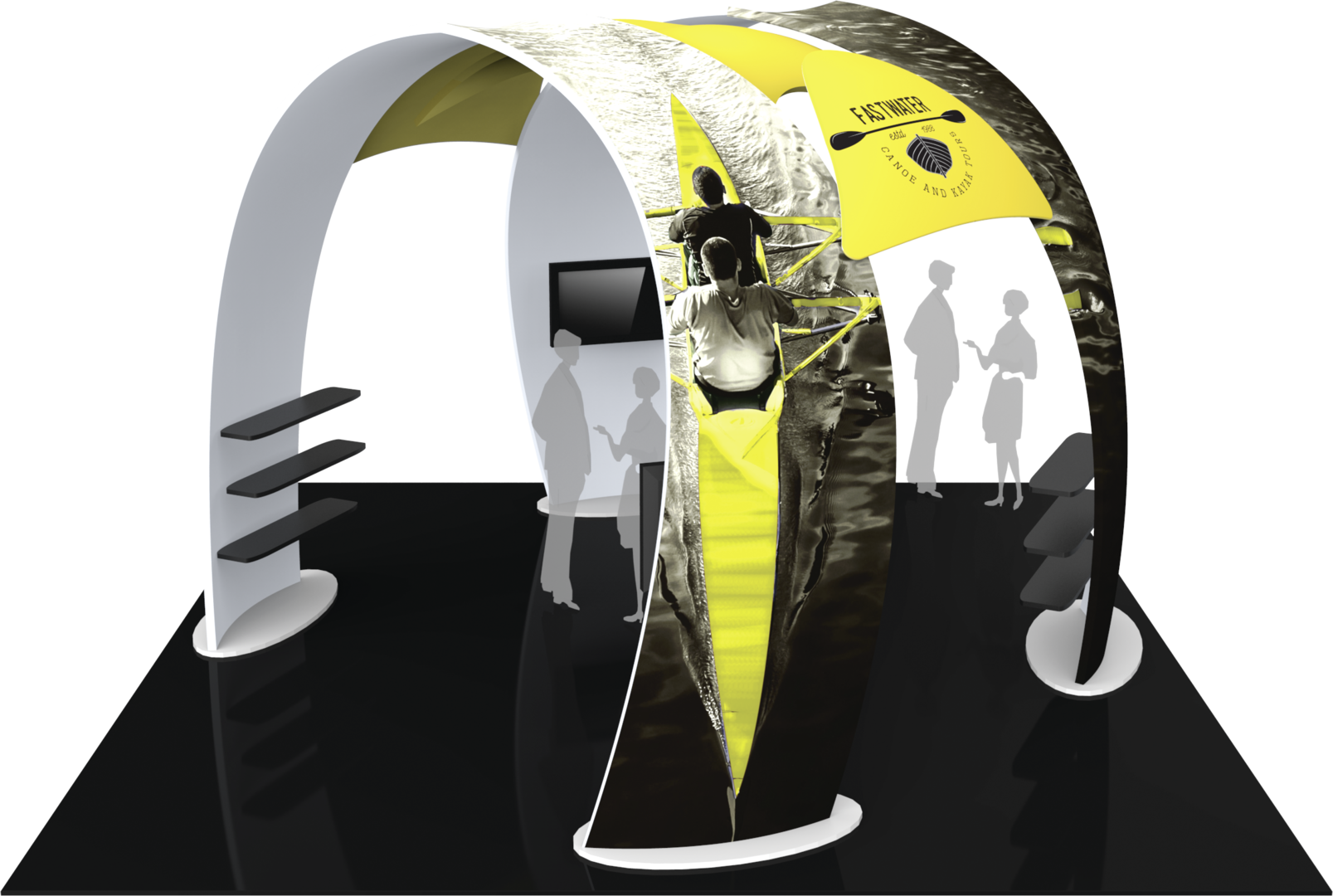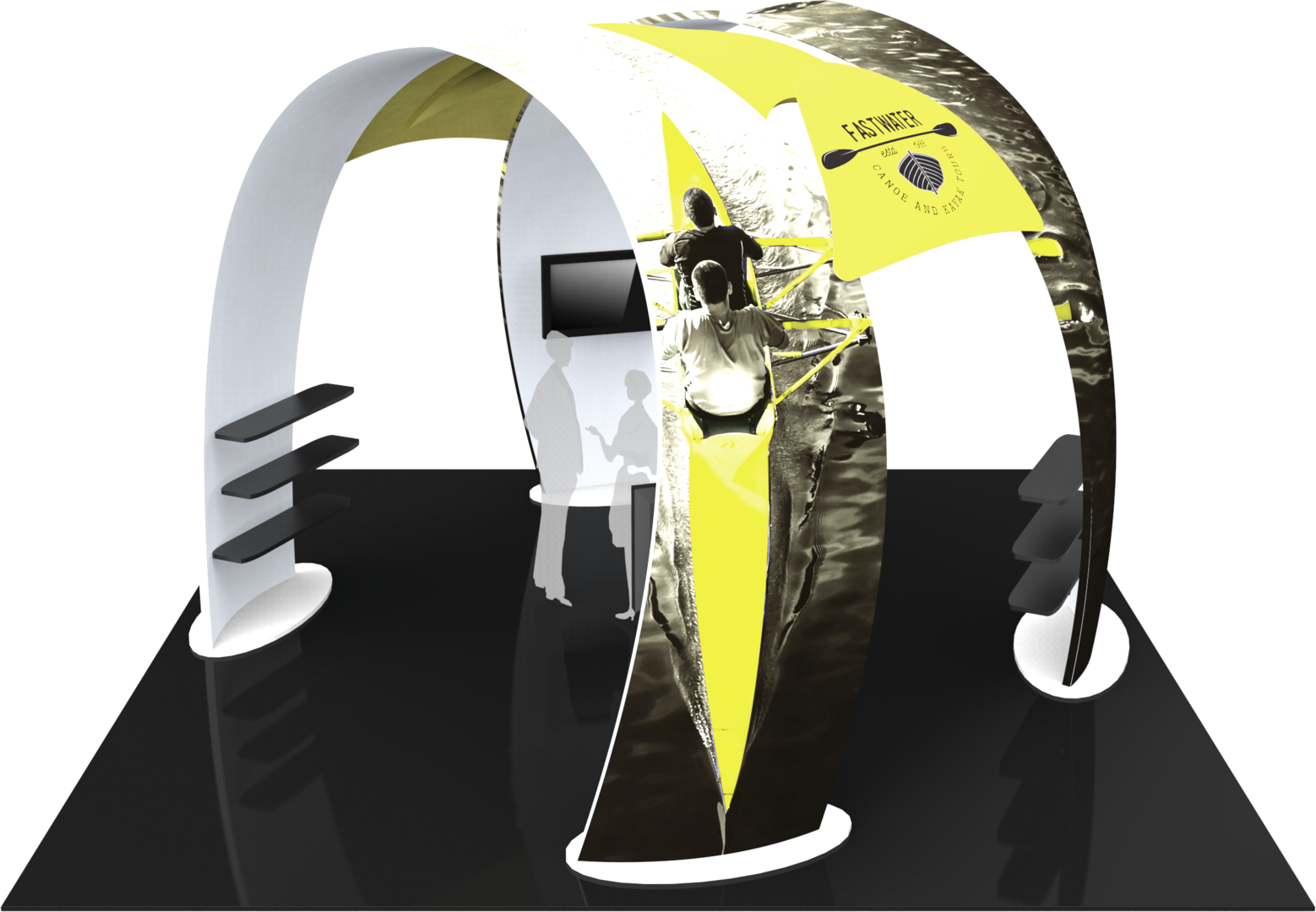 This organically-shaped, eye-catching structure allows for ample floor space for traffic flow, product demonstrations and engaging meetings. The 12.5′ tall, 16′ wide curved fabric arches provide areas within the space for shelving to display merchandise and products, as well as two areas for TVs to display digital media. One centrally-located fabric structure sits slightly underneath and in the middle of the two main arches, providing additional real estate for messaging and branding. Two canopy-like accent fabric structures connect the arches and are perfect areas for your company logo. Formulate® Fusion 07 combines five lightweight tubular frame structures with zipper-pillowcase fabric graphics. Display shelves and monitors mounts are included; medium monitor mounts hold 40-50″ TVs up to 50 lbs.