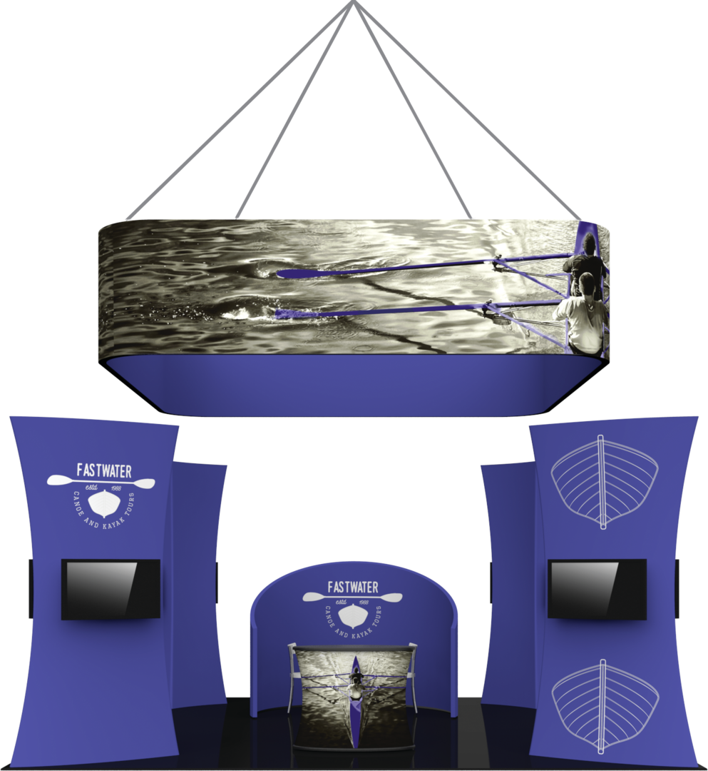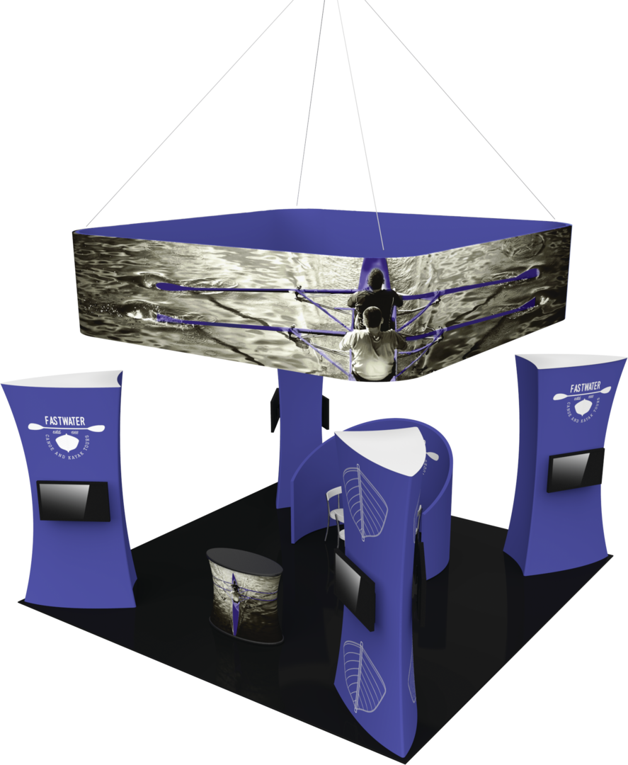 Formulate® Fusion Kit 10 combines a variety of off-the-shelf Formulate fabric structures to create a dynamic and charming exhibit! Hanging above is a rounded-corner 16′ square hanging structure, designed to proclaim your brand and help visitors find you in a crowded exhibit hall. Four 10′ tall, 5′ wide towers anchor each corner and are intended to help draw traffic inside the booth and engage passersby with multimedia messaging. Each tubular fabric tower features two 40″-50″ medium monitors to display digital media. A chip-shaped fabric wall sits near the center of the floor space, providing a semi-private meeting space that fits a small bistro-style table and three chairs or stools. A freestanding pillar-shaped fabric counter serves as an area for conversation and reception.