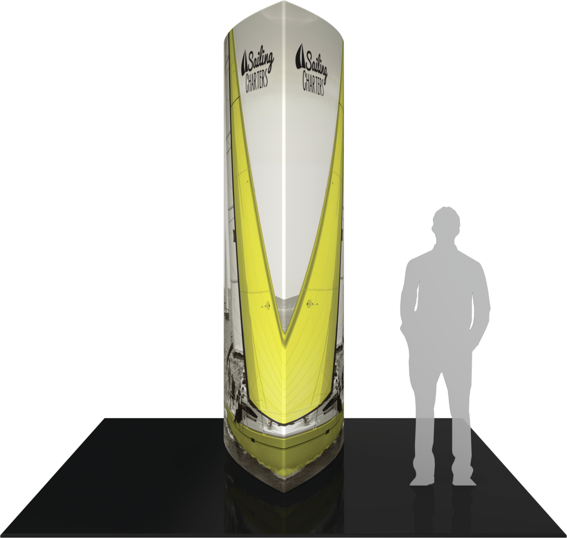 The Formulate® 10ft Shield tower combines the latest developments in fabric printed technology with aluminum tube frames to add dimension, decor and sculpture to any event, stage set, trade show booth or interior space. Formulate towers accommodate internal LED lighting. Accent LED light not included, but can be incorporated to add glow within the structures.