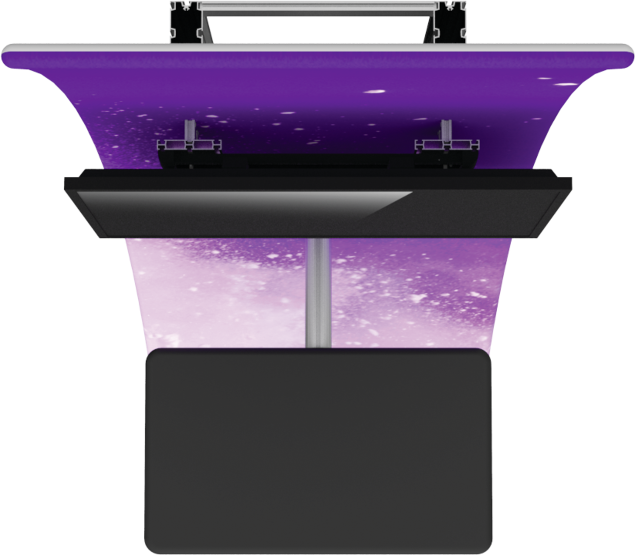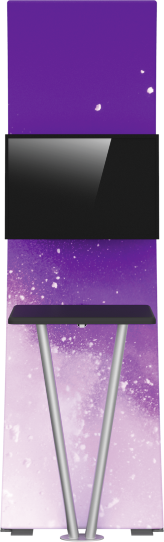 Formulate® Kiosk 01 couples a lightweight vertical curved aluminum tube frame with a printed stretch zipper pillowcase fabric graphic to create a funky and functional multimedia kiosk. An integrated monitor mount and table top provide space for digital messaging and display, and the gently curving back panel draws the eye.