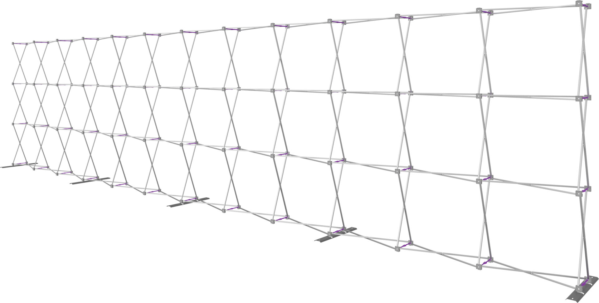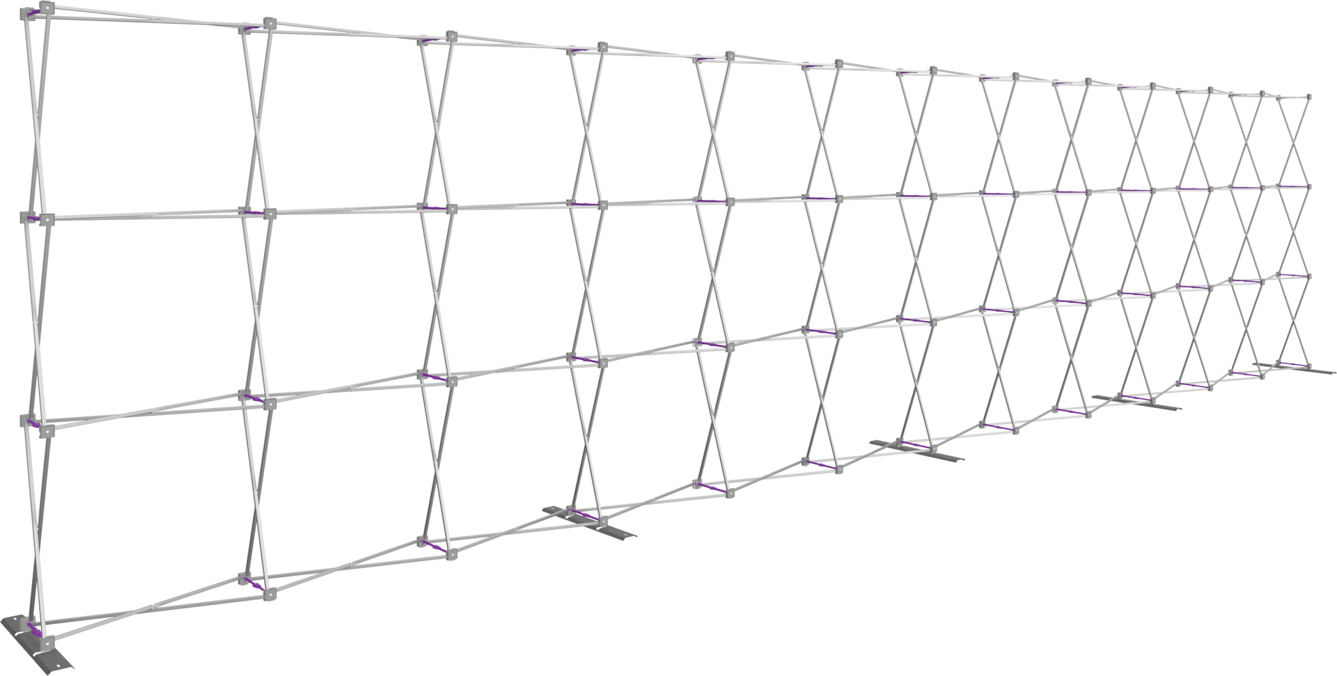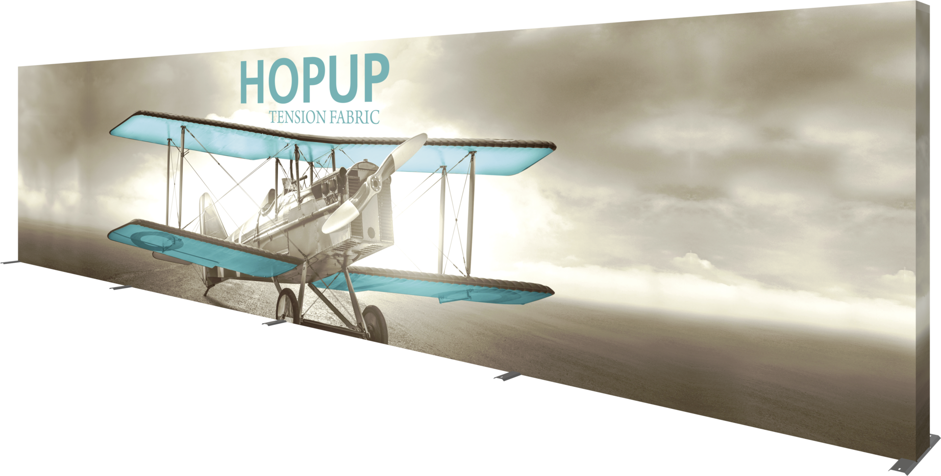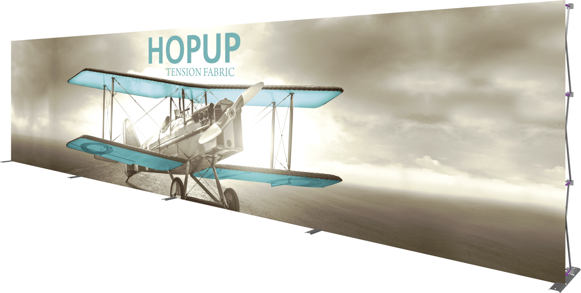 There is no mistaking the impact of the Hopup™ 30ft wide (12 quad x 3 quad) portable fabric pop up display. In large display areas, the 30ft backwall provides expansive real estate to create a dynamic display. Despite its size, the frame is easy to transport as it is both lightweight and collapsible. A wheeled hard case is available as an optional accessory to transport and store this display. Assembly requires two people, yet does not require tools and still sets up quickly and easily. Simply expand the frame with pre-attached graphics and you have the perfect full height, 30ft wide display.