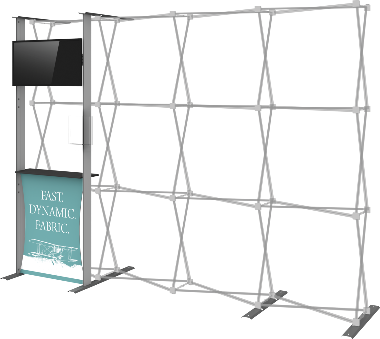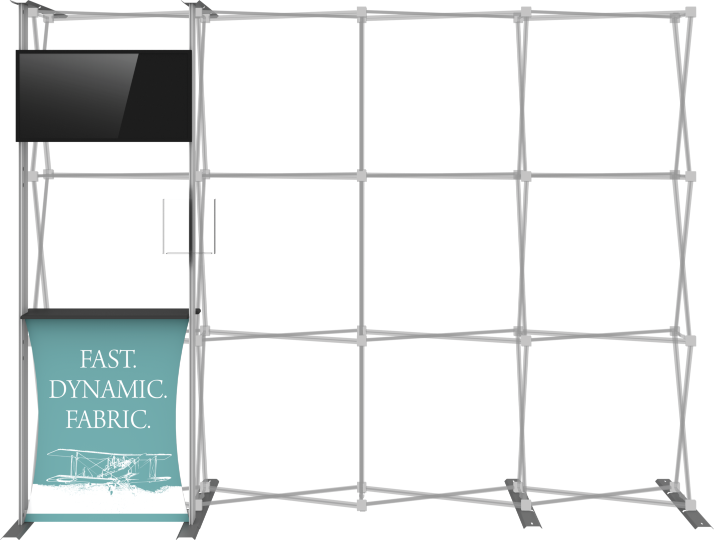 Hopup™ tension fabric backwall Accessory Kit 03 is an easy way to add style, flair and function to any 10ft wide straight Hopup display. Accessory Kit 03 includes an accessory counter with monitor mount, printed fabric graphic and literature pocket. The accessory counter and monitor mount provide extra real estate for messaging. Accents quickly attach to any 10ft Hopup for a no-stress display. Dimensional elements can be placed in the middle, left or right sides of the display. Backwall is not included.