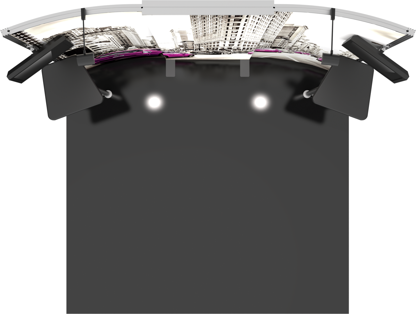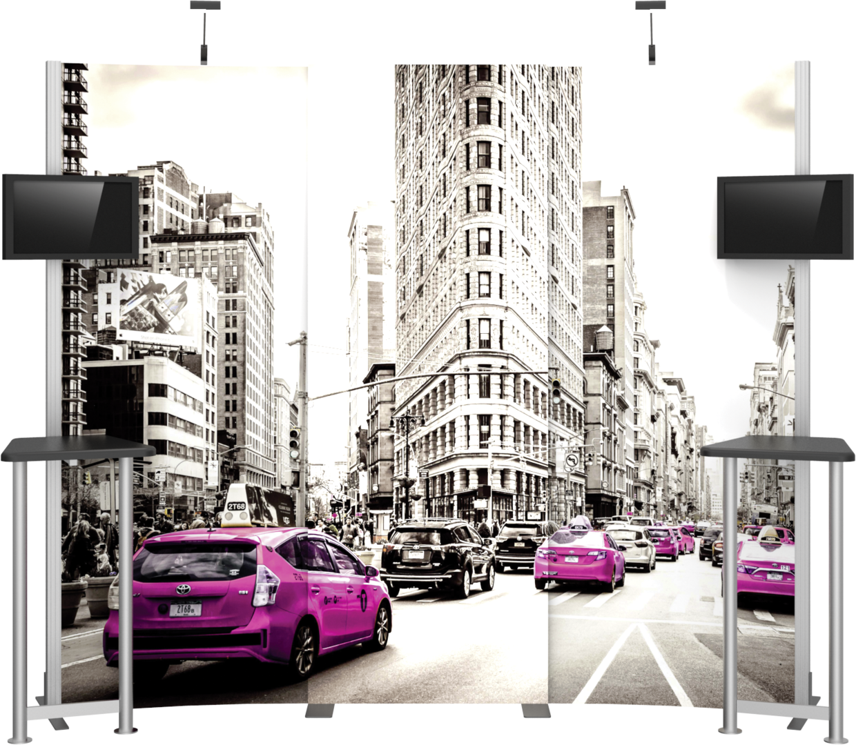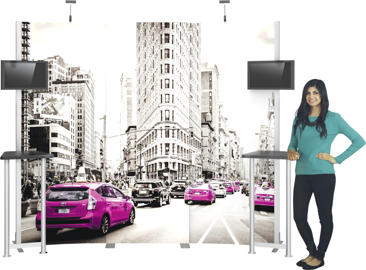 – Kit includes frame, two fabric graphic panels, one illuminated graphic panel, two tables, two 200 LED floodlights, two small monitor mounts* and two molded OCH2 cases