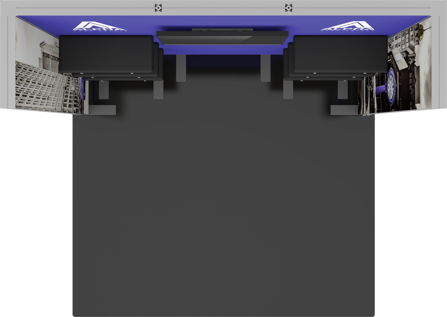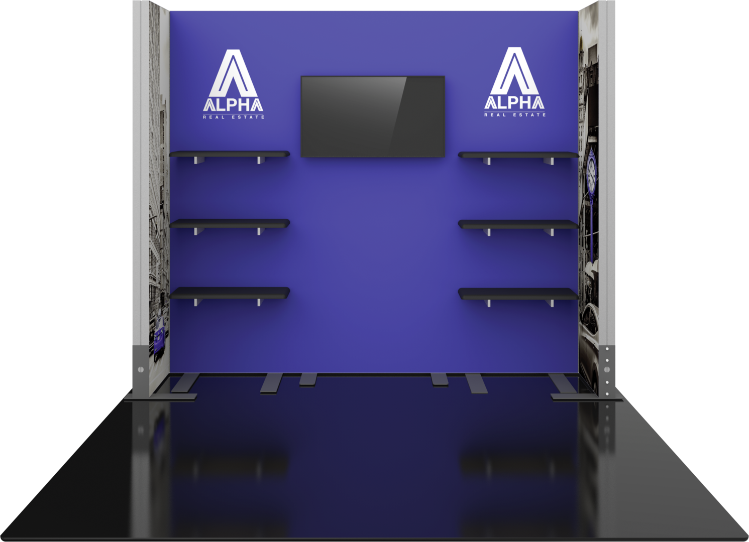Hybrid Pro™ Modular Kit 21 is a dynamic modular exhibit that features an 8′ tall backwall, two sidewalls|six shelves for small product display and a central monitor mount that holds a medium sized monitor. Push-fit SEG fabric graphics are easy to apply to the backwall and the interior and exterior facing side walls.