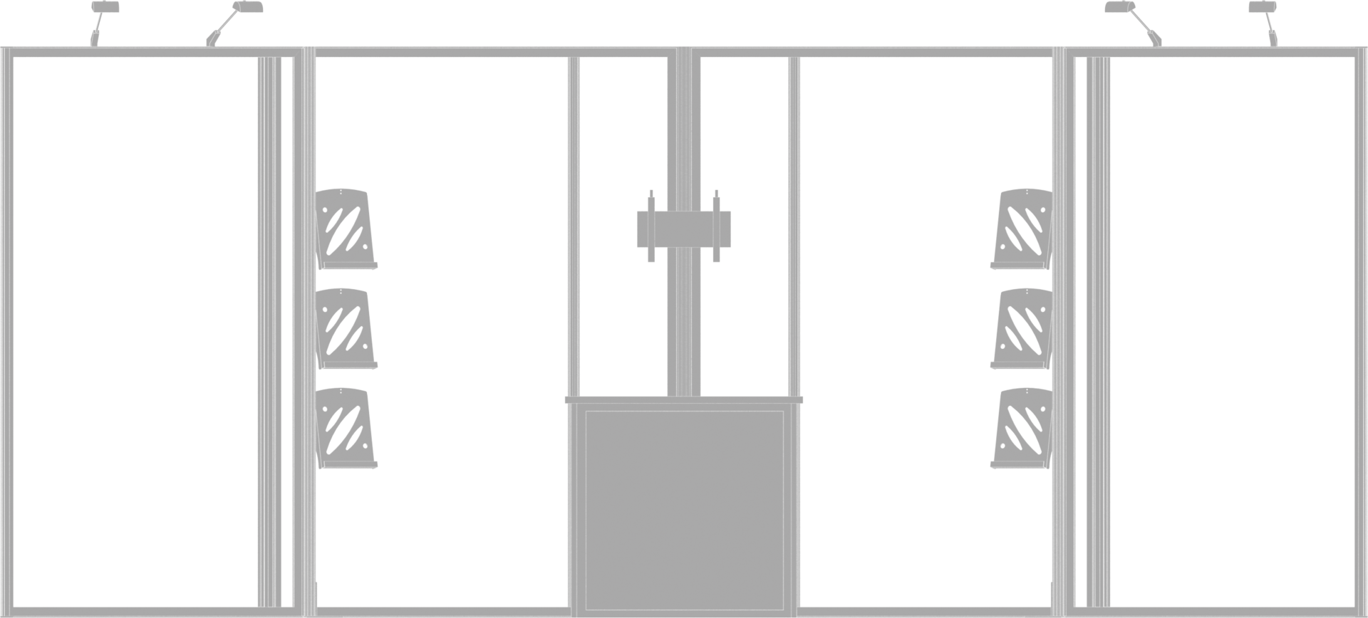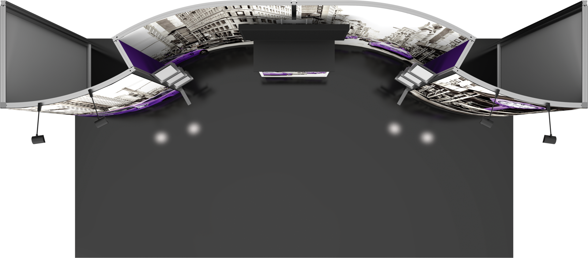 – Kit includes frame, six fabric graphic panels, one counter*, four 200 LED floodlights, one medium monitor mount*, six literature holders and one molded SCRATE case