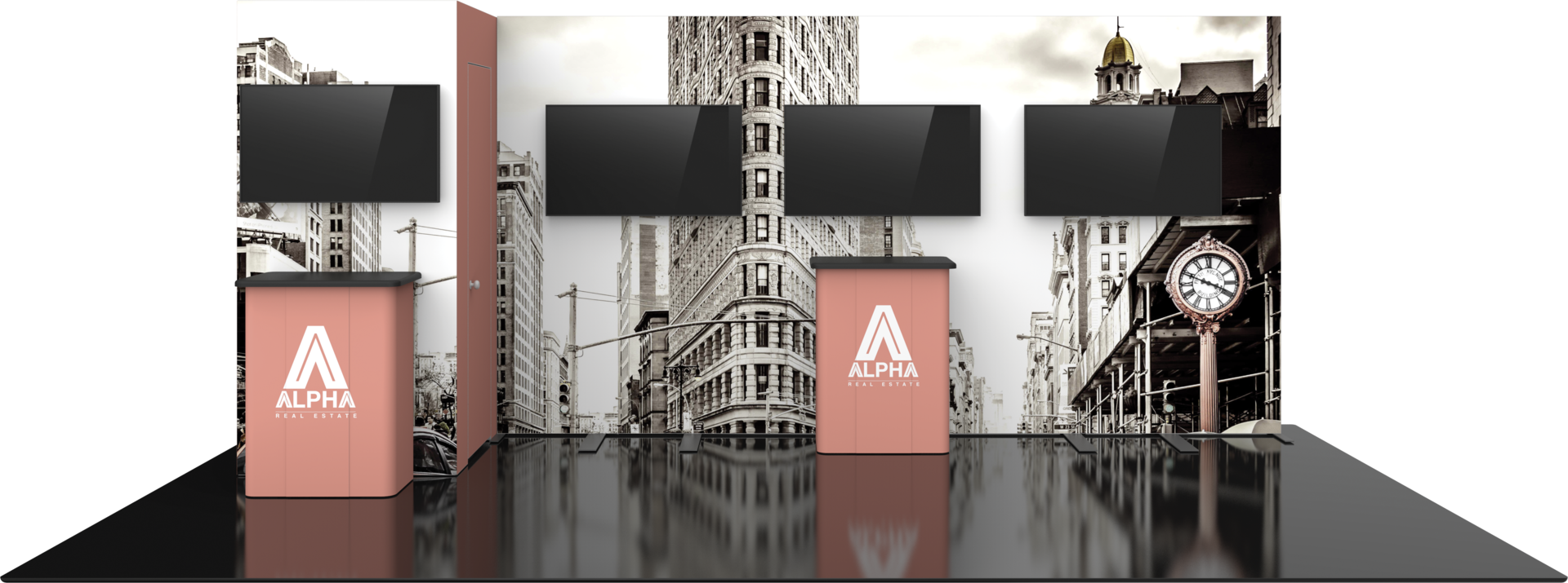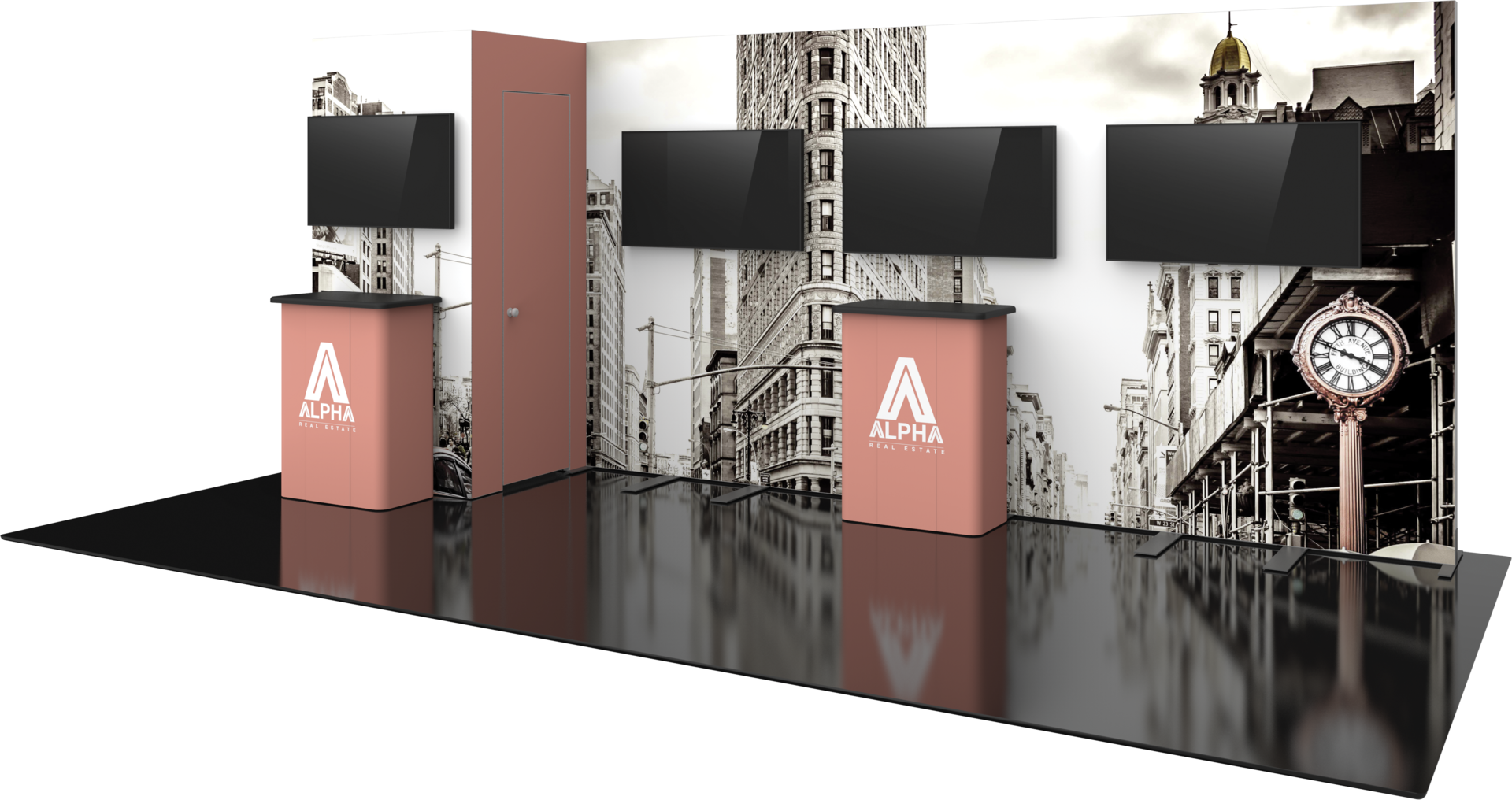 Hybrid Pro™ Modular Kit 25 is unique modular exhibit that offers ample backwall space for multimedia display and graphic messaging. This 20′ inline exhibit includes a locked storage closet on the left hand side, which is ideal for storing giveaways, prizes, collateral and booth staff belongings. The backwall display counters works well with monitors placed above for reception and demonstrations. This exhibit kit has it all! Push-fit SEG fabric graphics are coupled with extrusion frames for a seamless, sleek look.