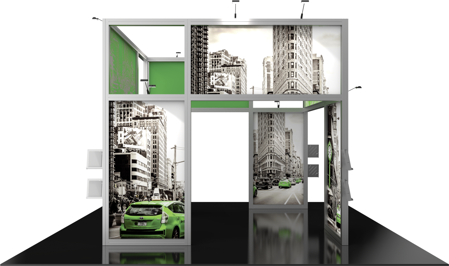 – Kit includes frame, sixteen fabric graphic panels, one white laminate counter, eight literature holders, sixteen 200 LED floodlights and one woodcrate