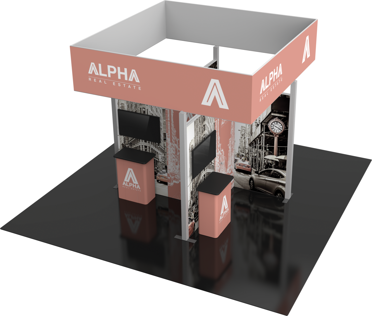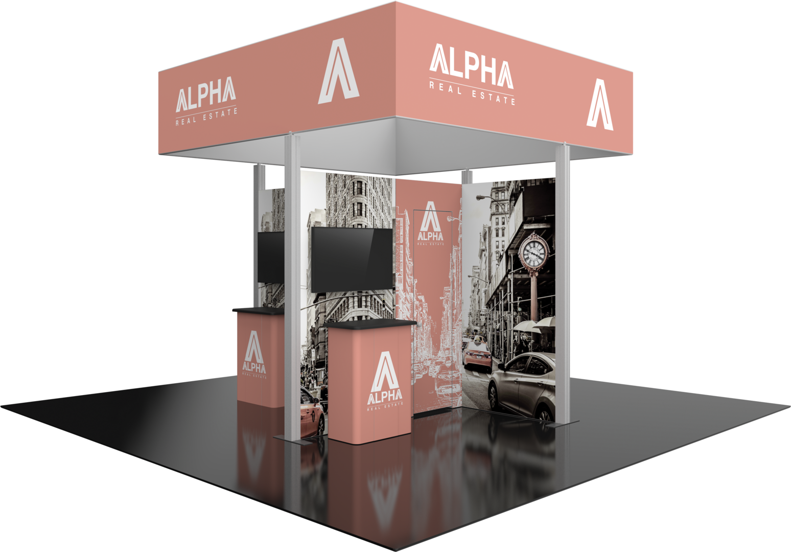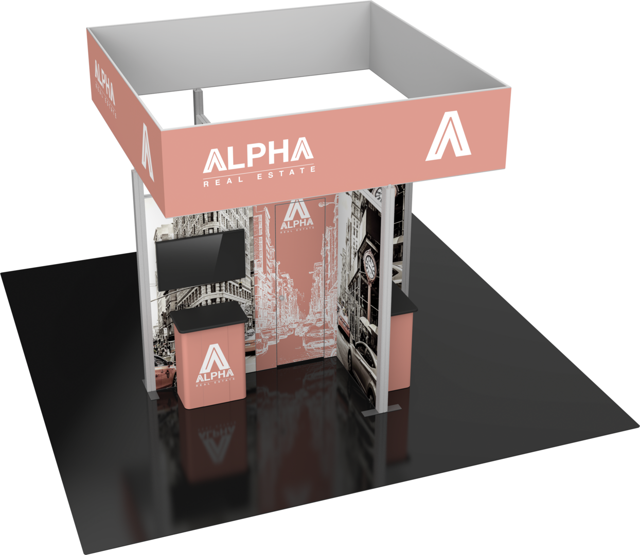 – Features 12’w x 3’h square fabric structure up high to draw visitors to the booth