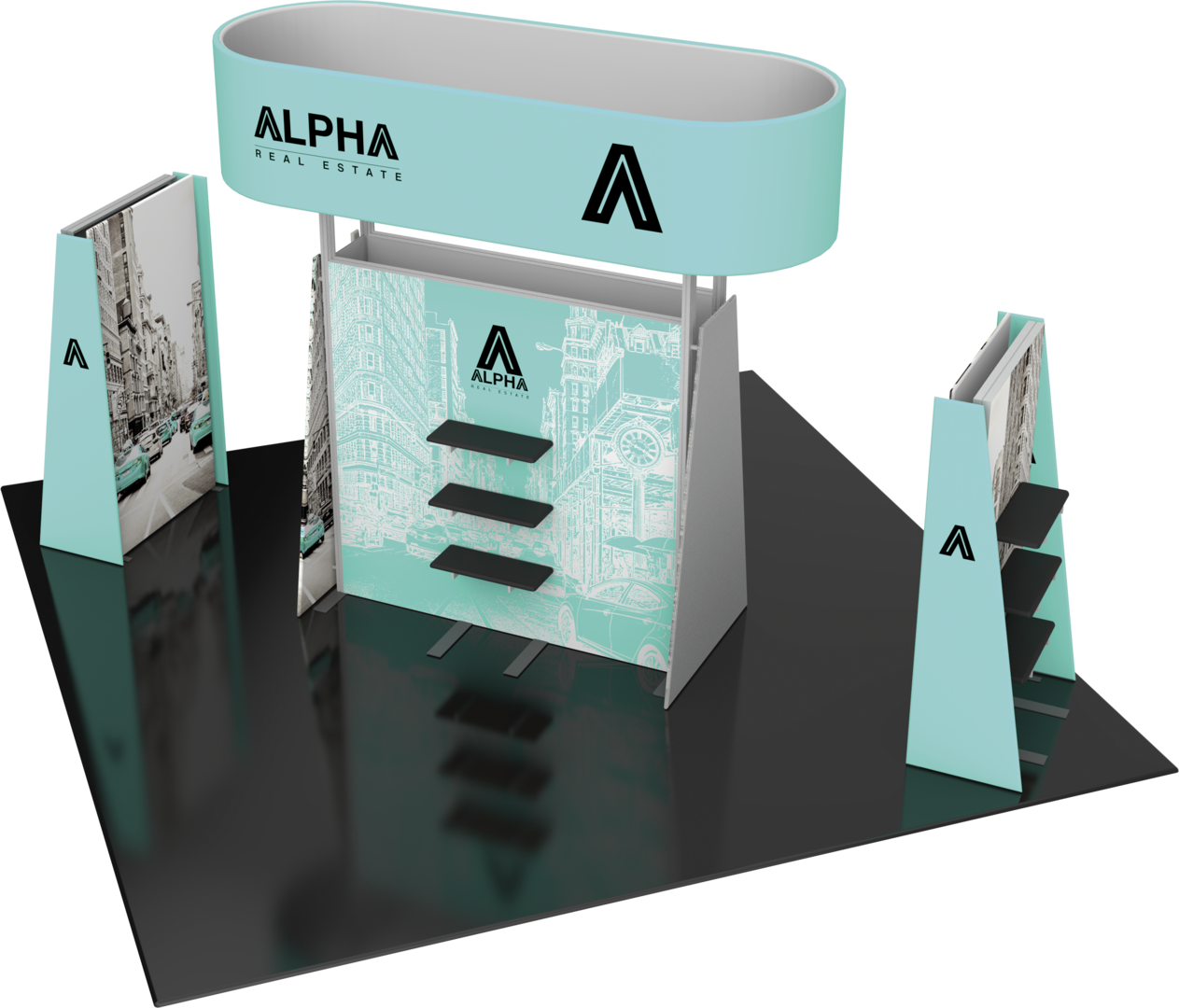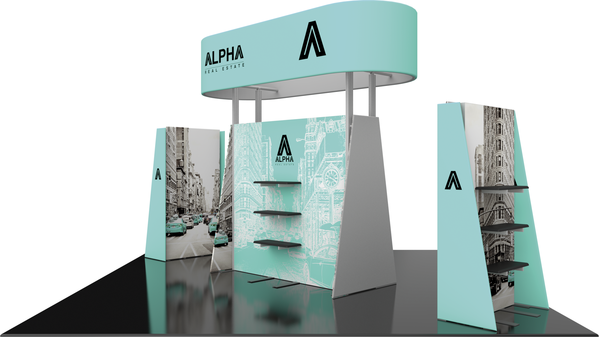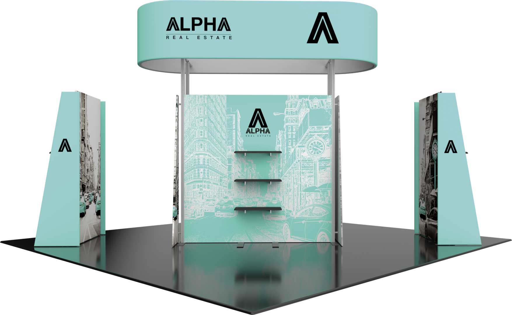 – Each kiosk includes four walls, two pillowcase fabric graphics and two push-fit fabric graphics, and three shelves for product display