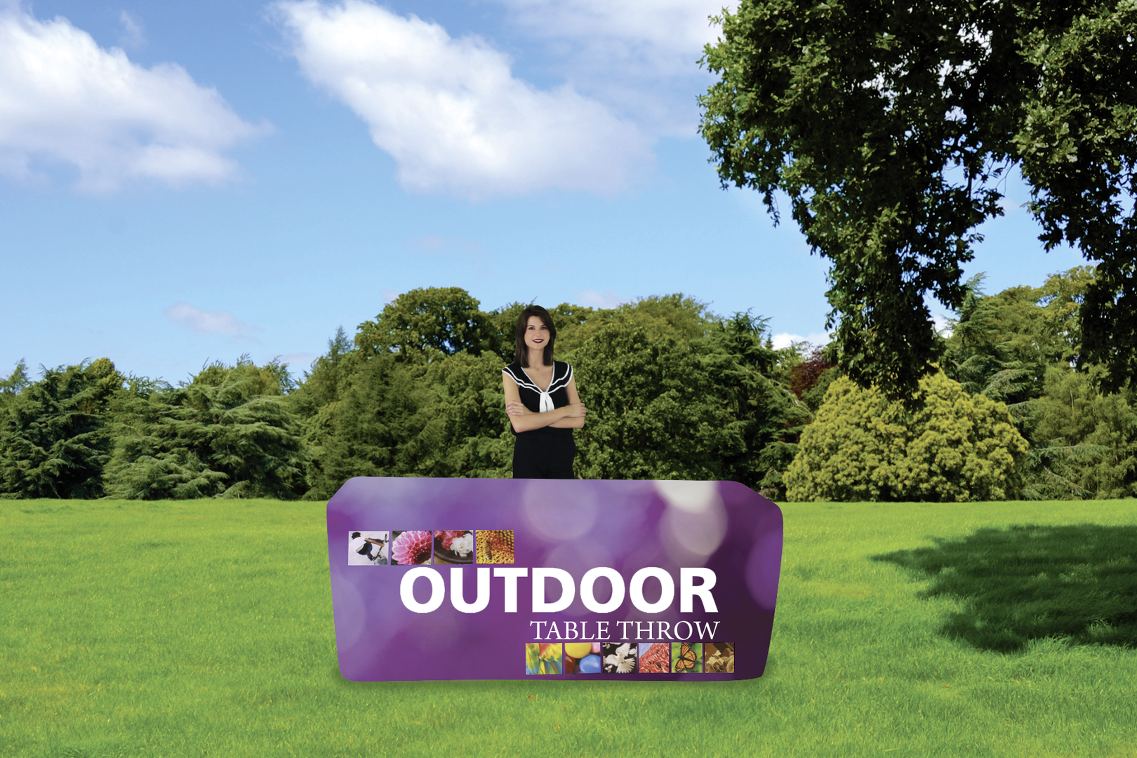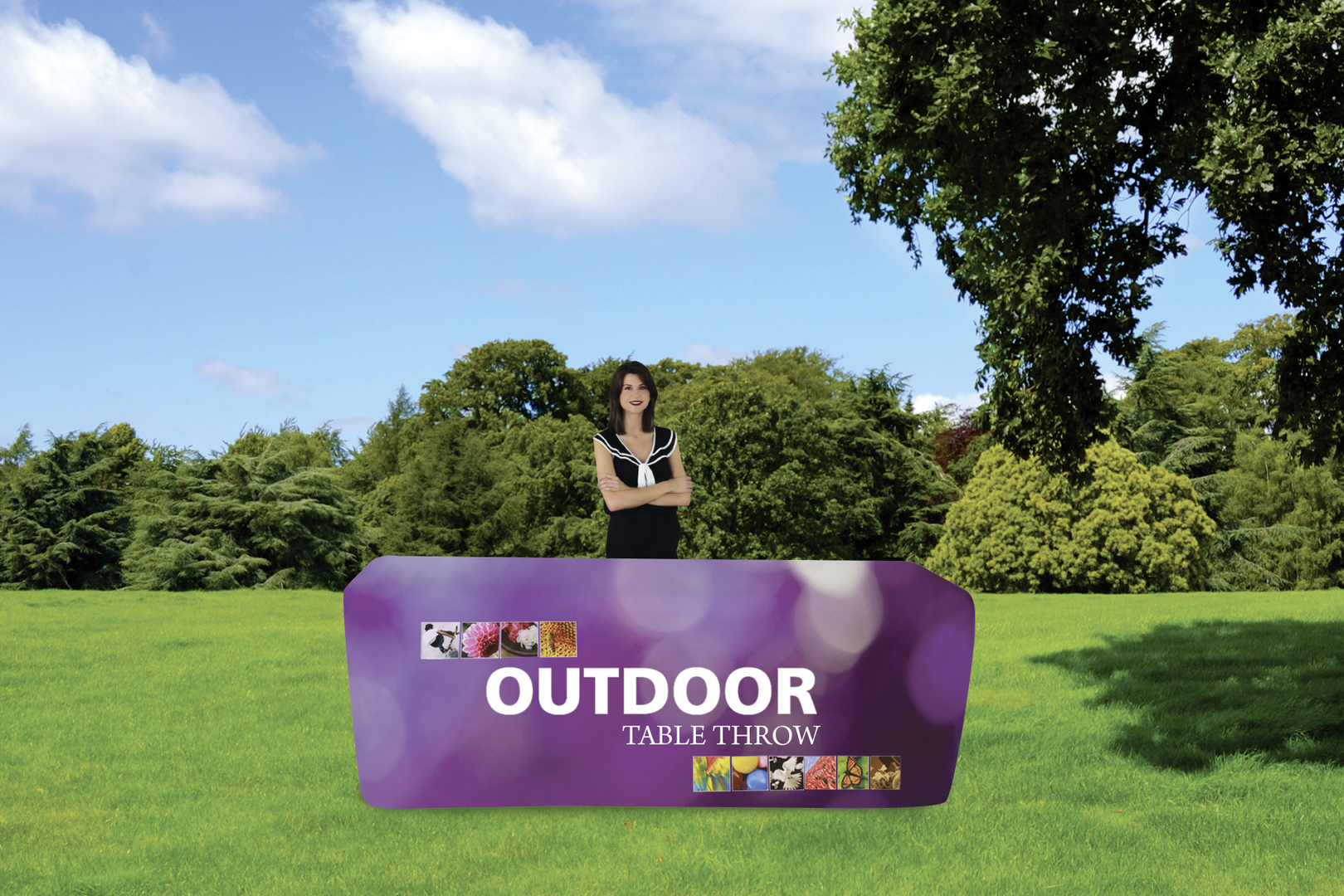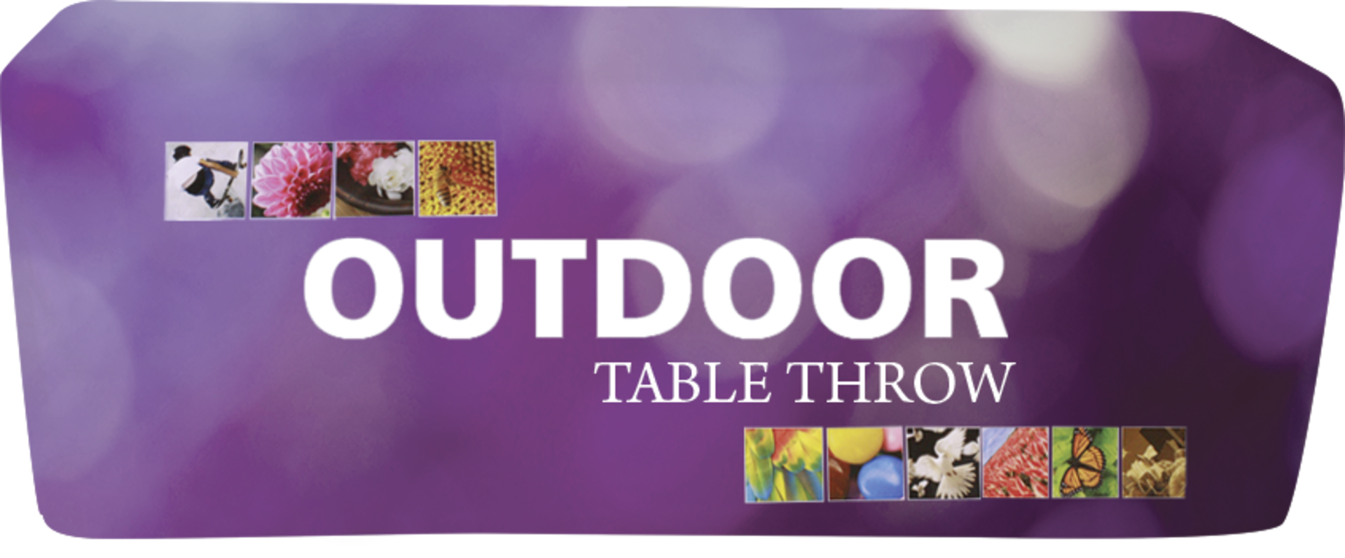 Outdoor table throws are form-fitted to standard 8ft and 6ft tables, creating a wind-resistant, secure accent for outdoor displays. Fully-printed in the USA on water and spill resistant outdoor canvas to create durable, full-color graphics, the Outdoor table throw will complete any outdoor event or display.