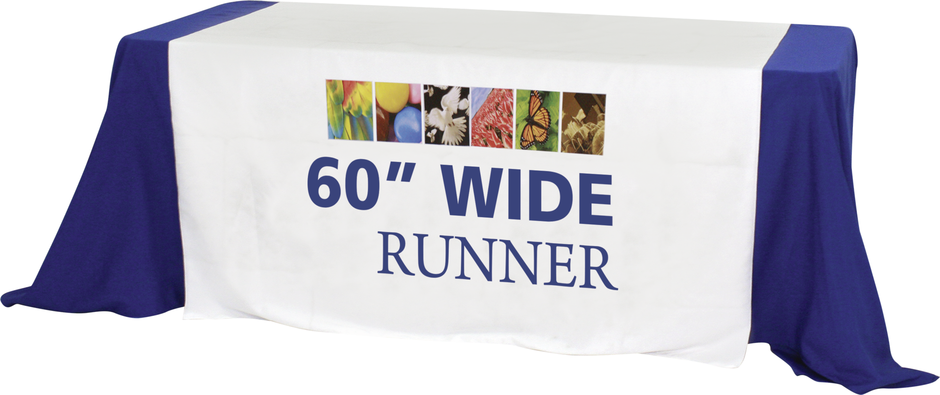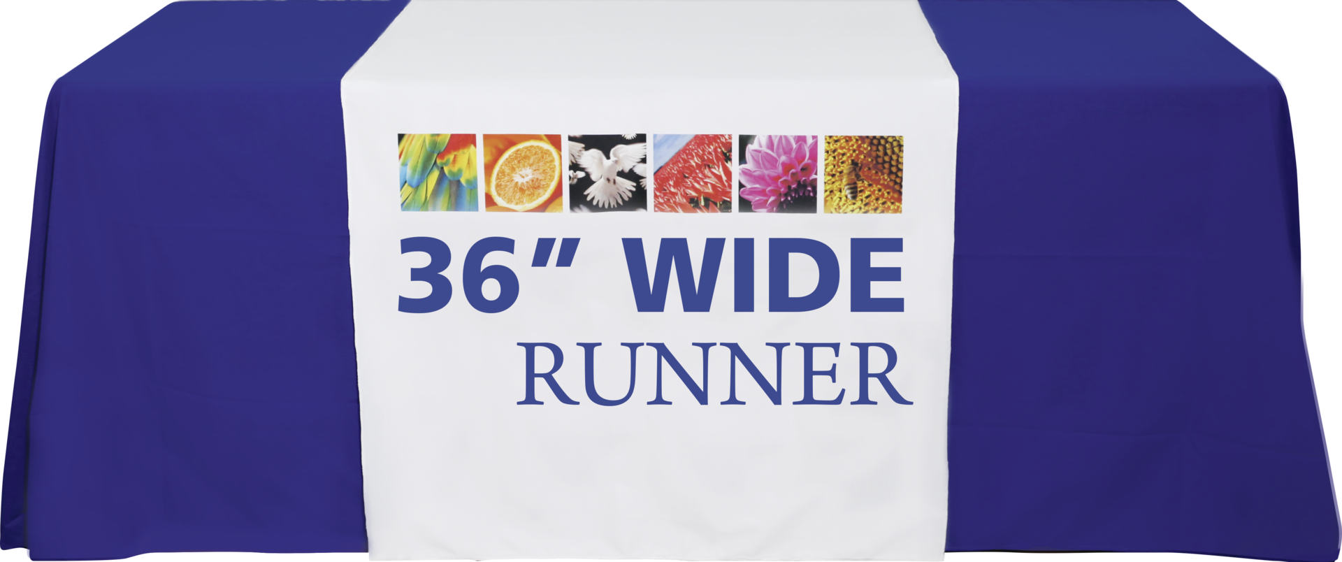 Complete your presentation with a 60″, 36″, 30″ or 24″ full-coverage dye-sublimated printed table runner. Table runners are ideal for use at events, trade shows and in retail environments to easily add a customized, professional and branded appearance to any tabletop display. Runners are printed and finished in the USA on washable polyester using dye-sublimation to ensure the highest level of color vibrancy and material quality.