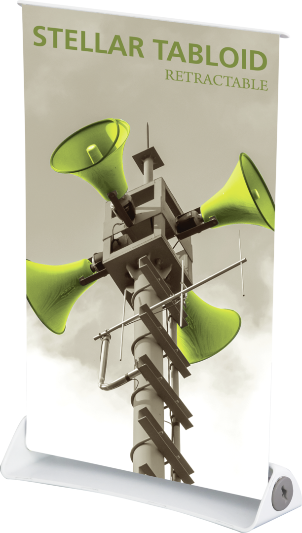The Stellar Tabloid is a lightweight, injection-molded white plastic tabletop retractable banner stand ideal for adding messaging to tabletop displays and exhibits without sacrificing valuable space. Stellar Tabloid measures 11.6″W x 17.75″H and provides big impact with unique styling.