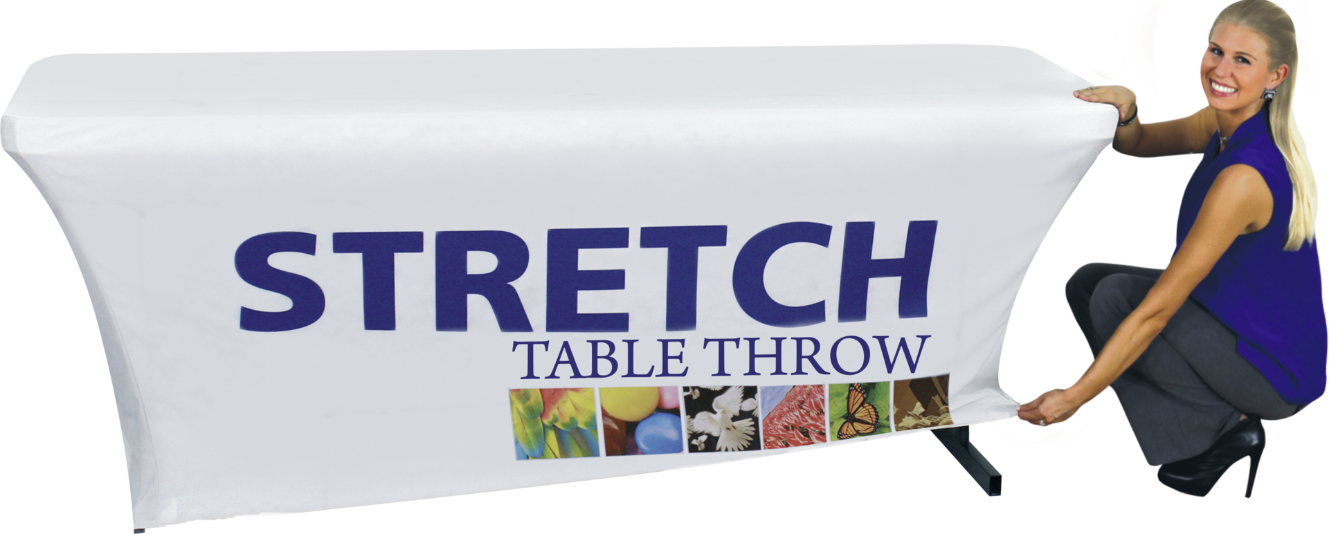 Complete your presentation with a stretch, dye-sublimated printed table throw. Stretch table throws are tailored to fit standard 8ft, 6ft, 4ft and tall 4ft (48″W x 36″H demo table) tables from top to bottom, providing a stylish, customized and branded appearance for use at events, trade shows and in retail environments. Table throws are fully-printed on washable polyester using dye-sublimation and include a back zipper for easy application.
