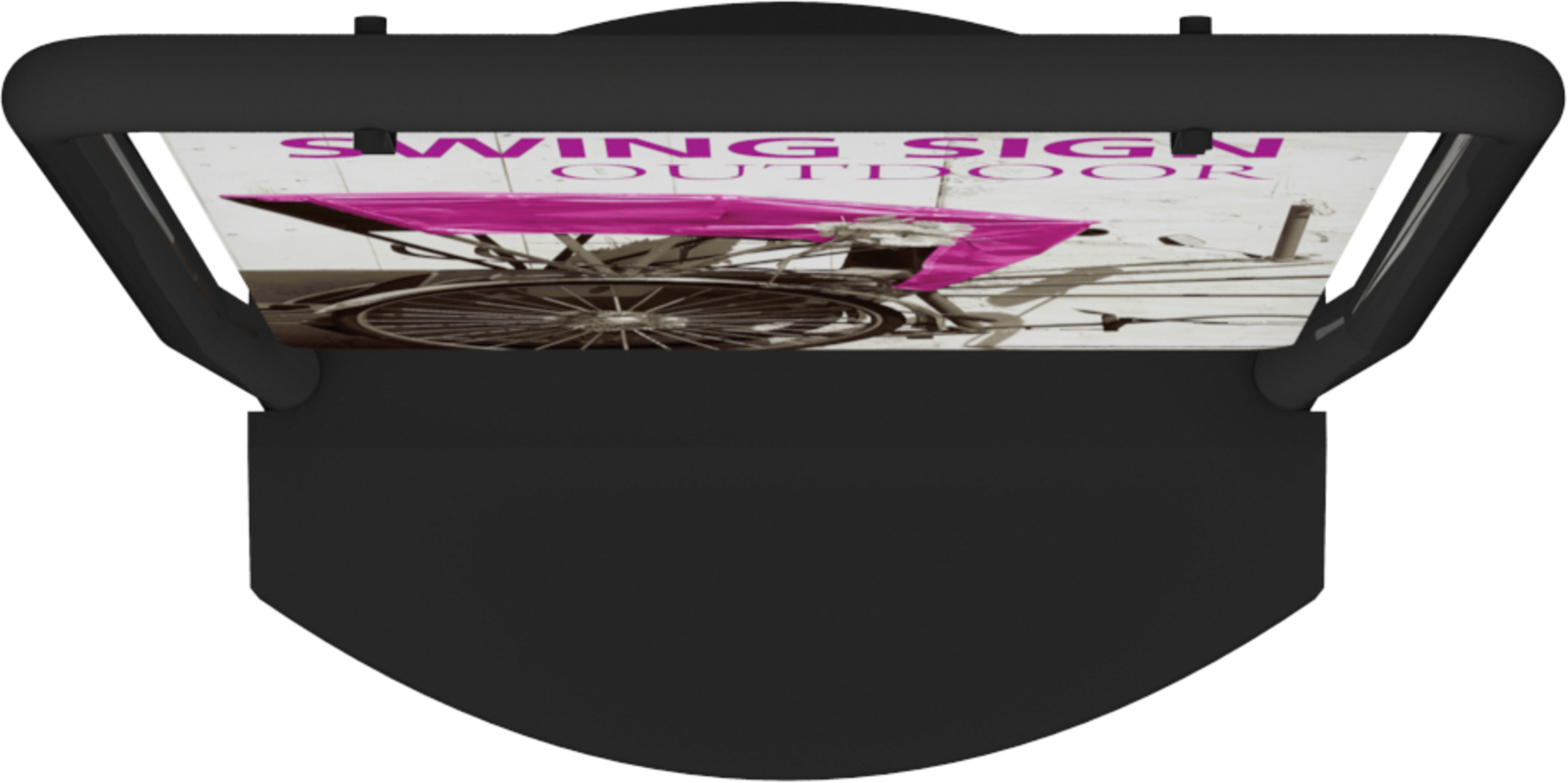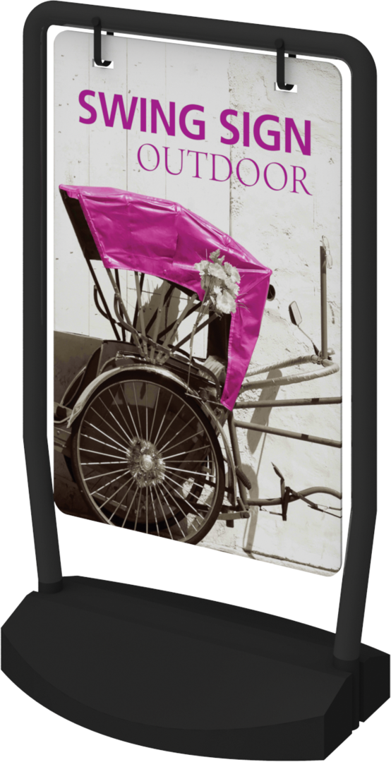 The Swing Outdoor Sign is a sleek and portable outdoor sign featuring an economy black steel tube frame, double ring mounting clips to keep graphic securely in place and wheeled, fillable base. The Swing Sign allows for easy graphic changes and replacements and comes with your choice of single or double-sided graphics printed on 6mm PVC board. The wheels make the sign easy to move!