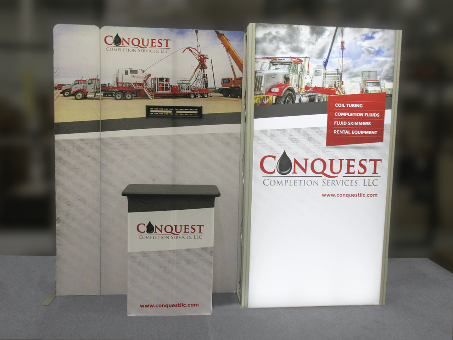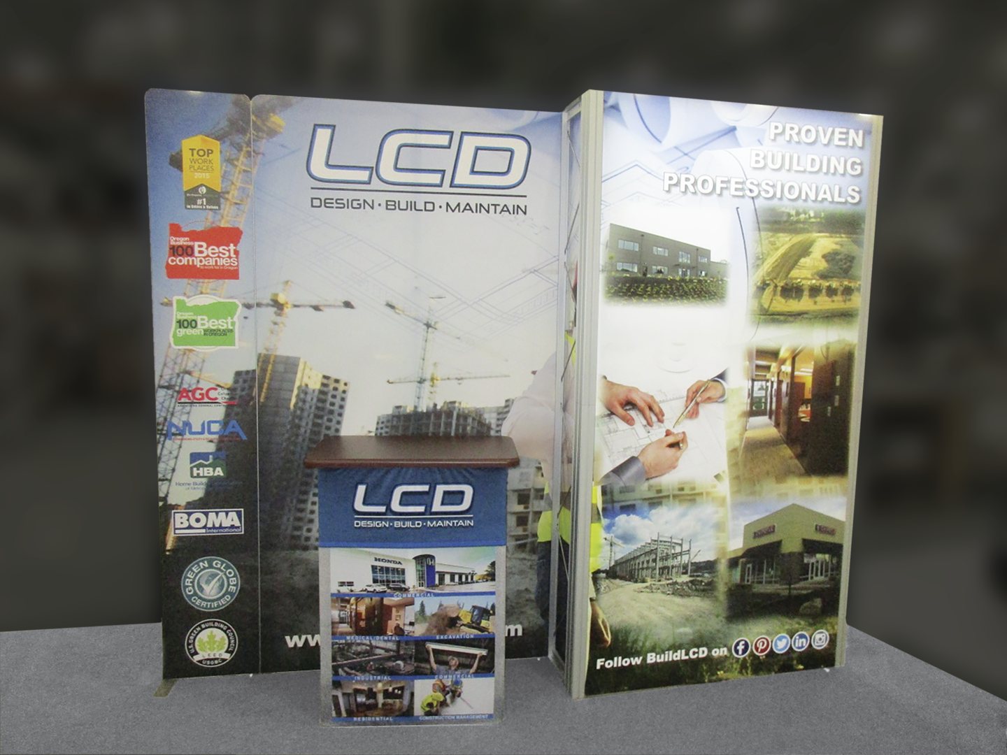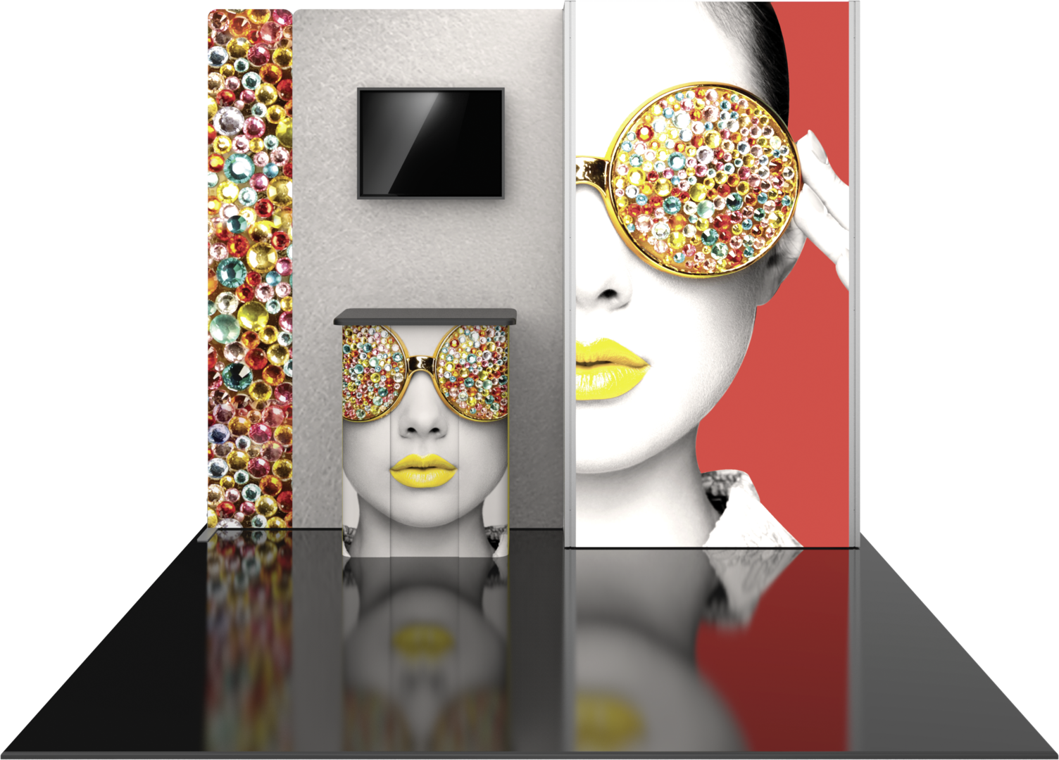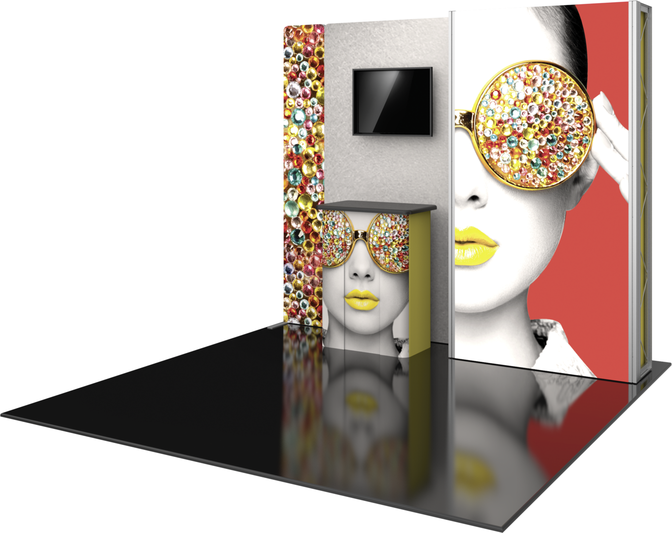 – Kit includes frame, four fabric graphic panels, one illuminated fabric graphic panel, one counter, monitor mount and three wheeled molded cases