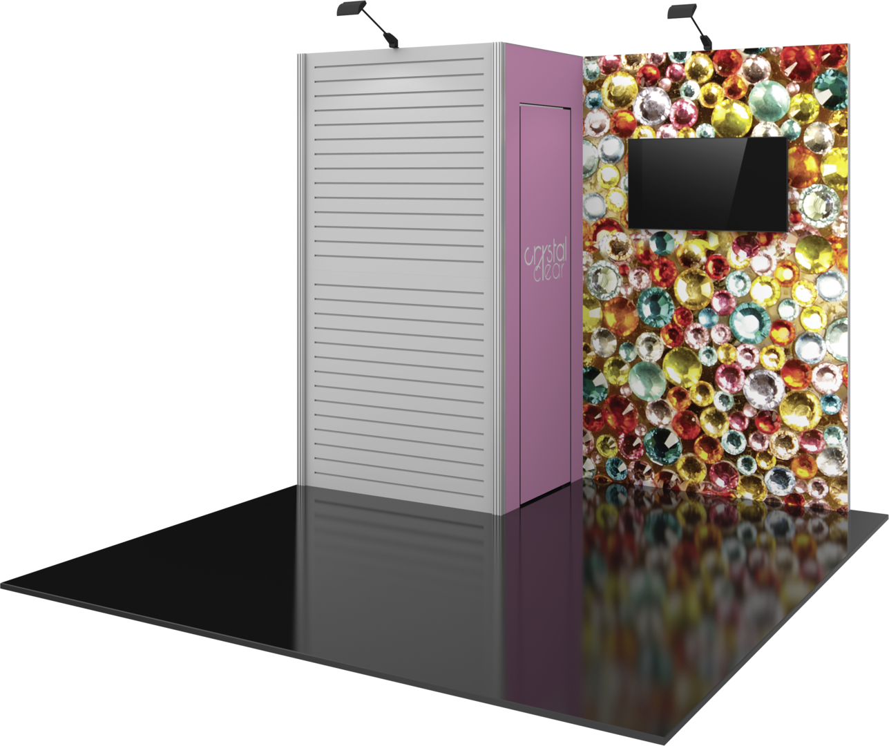 The 10ft x 10ft inline Vector Frame™ Kit 25 is an innovative and contemporary exhibit that provides a sleek appearance and excellent features and functionality. Kit 25 couples vibrant, dye-sublimated push-fit fabric graphics with simple extrusion frames. Kit 25 includes accent lighting, a monitor mount, an entire slot wall to hang merchandise from and lockable closet for storage.