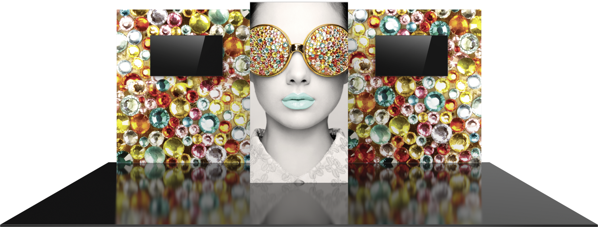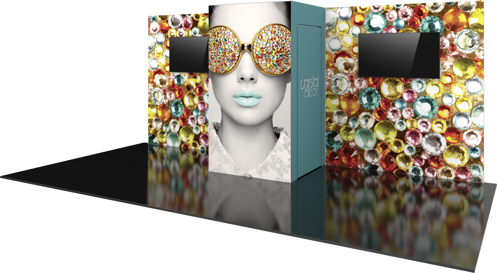 The 10ft x 20ft inline Vector Frame™ Kit 27 is a symmetrical modular exhibit that offers accessible storage, lots of area for messaging and branding and digital promotion! Extrusion frames are coupled with push-fit SEG graphics to create a sleek, seamless appearance. Closet features a ample storage and the kit includes two medium monitor mounts to hang TVs or LCD screens.