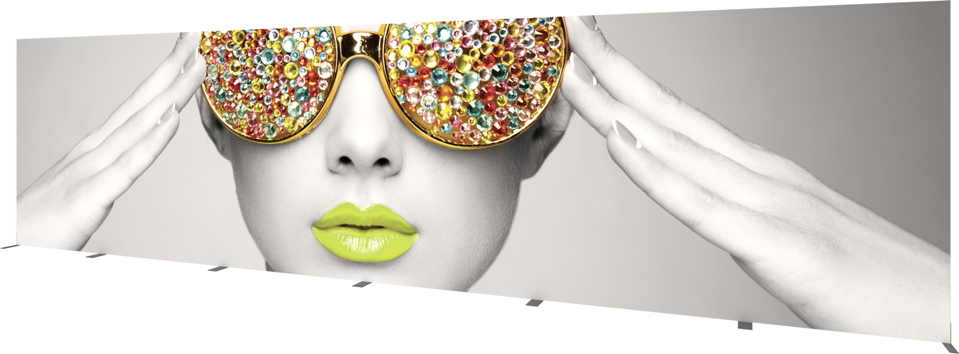 Vector Frame™ fabric banner R08 is a modern, near 30ft wide extrusion-based fabric banner display. The 2″ aluminum extrusion frame is easy to assemble and disassemble and comes with the choice of one large, seamless single-sided or double-sided push-fit SEG fabric graphic. Vector Frame banner R08 is an ideal display for retail, corporate, event and trade show environments.