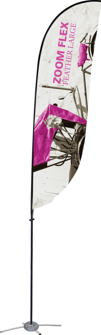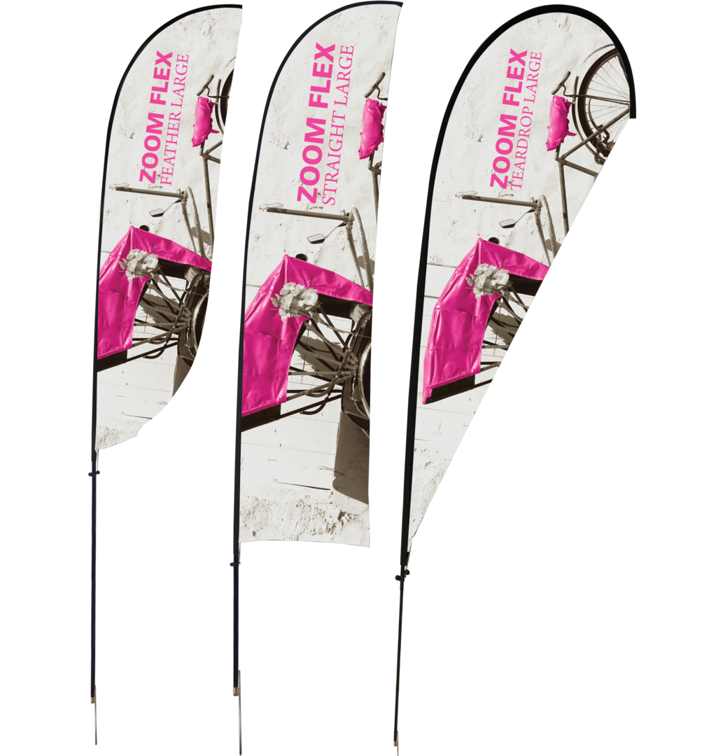 The dynamic Zoom Flex Large Flag provides the ultimate advertising display solution for your business. The flag features a durable fiber pole and wind-resistant flag, usable in outdoor environments but also an excellent option for indoor display needs. Zoom Flex has single and double sided display options, and come in three shapes – Feather, Straight, and Teardrop. Heights vary based on flag shape, and can extend up to 178.38″ in height (14.8ft). Ground stake and storage sleeve are included. Product not designed to withstand adverse weather or high wind. Weather damage is not covered by product warranty.